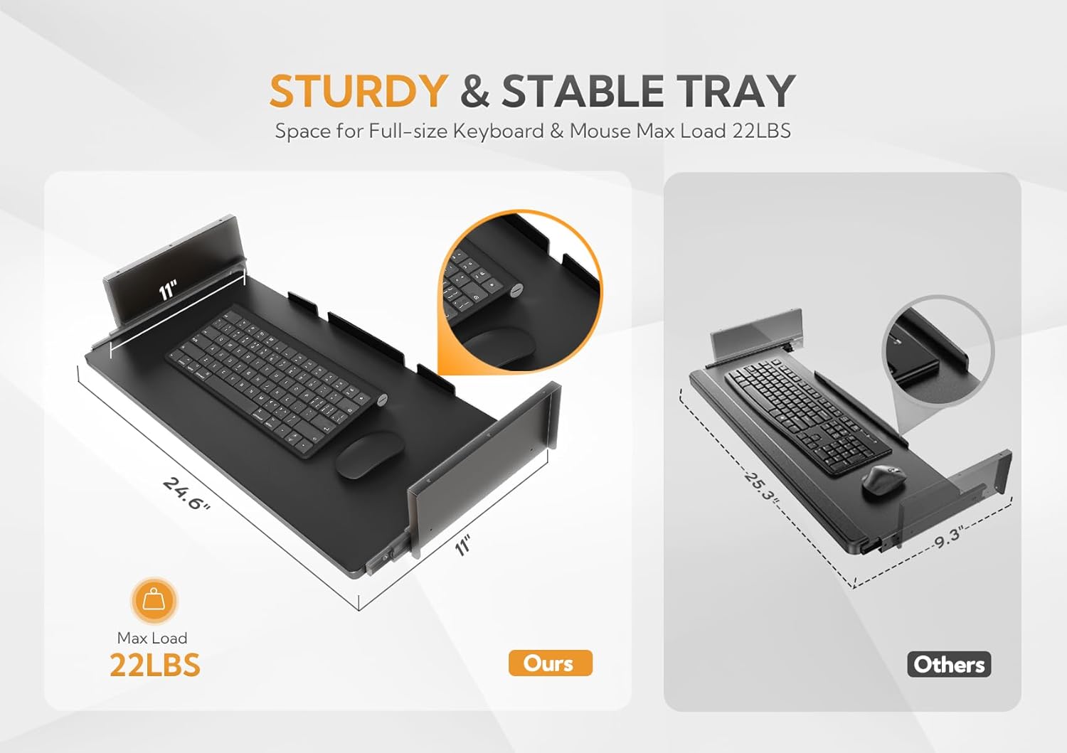 - Spacious Full-Size Keyboard Tray: The standing desk is equipped with a specially designed slide-out keyboard tray, measuring 26.8" X 9.8". This is larger than most keyboard tray sizes on the market, allowing for a full-size keyboard to be placed and providing a greater operational space.