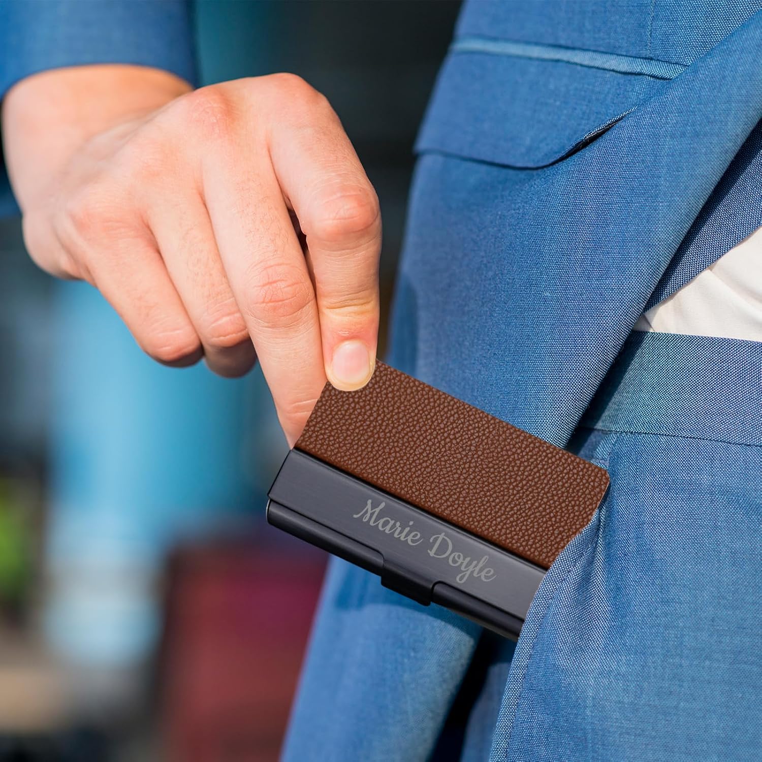 - Personalized business card holder can protect your cards from damage such as bending, tearing, or getting dirty, while keeping them organized for easy access. Our selected leather material is durable, high-quality, and reliable, making it a great choice for a business card holder.