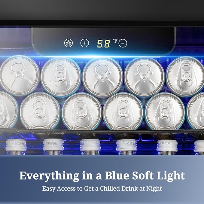 - Elaborate designοΌThis Beverage cooler runs on a powerful but quiet compressor. Built-in blue LED light allows you to clearly find drinks even at night as well as makes your drink look more precious. It also has adjustable shelving for a variety of beverages
