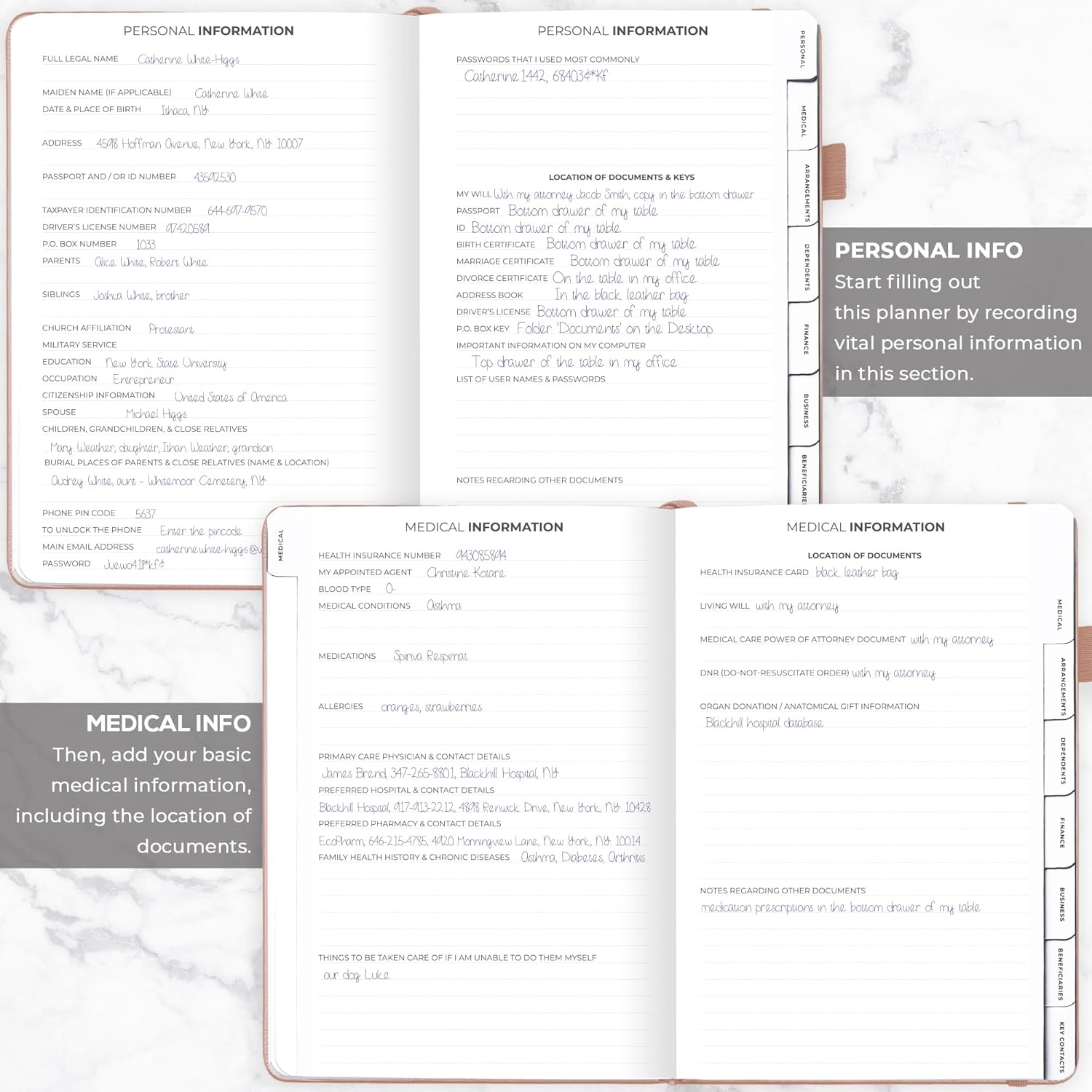 - MEDICAL & FINANCIAL INFO, INSURANCE POLICIES, ACTIVE MEMBERSHIPS & MORE: Inside this funeral planning workbook, you can add care instructions for dependents and pets, personal property, finance & business info, insurance policies, beneficiaries, and more.