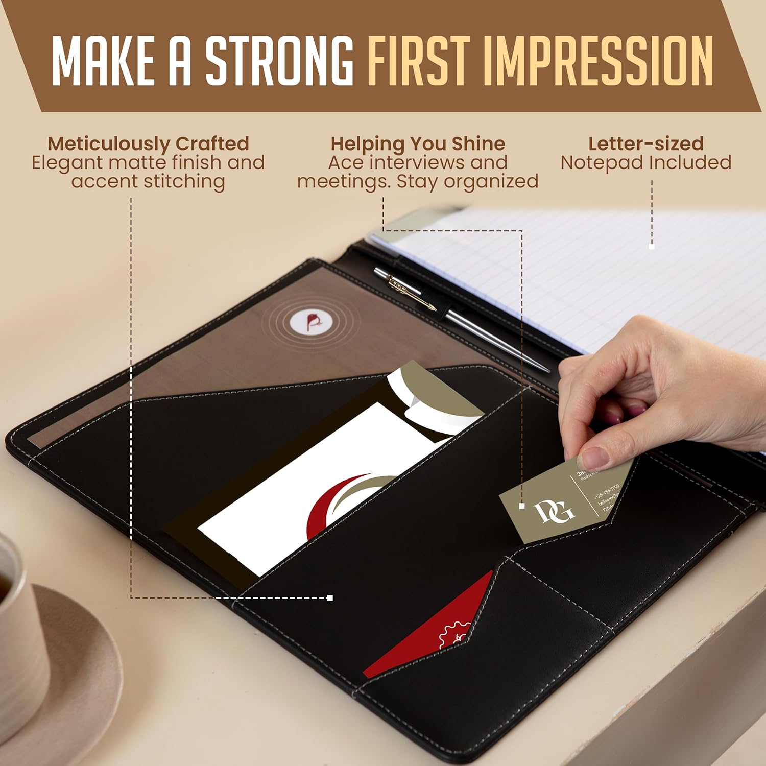 - β SLEEK & PROFESSIONAL: Make a strong first impression with this modern portfolio with a classy piano black matte finishing. This faux leather folder is water resistant and fits most briefcases & bags, making it the ideal padfolio for women and men.