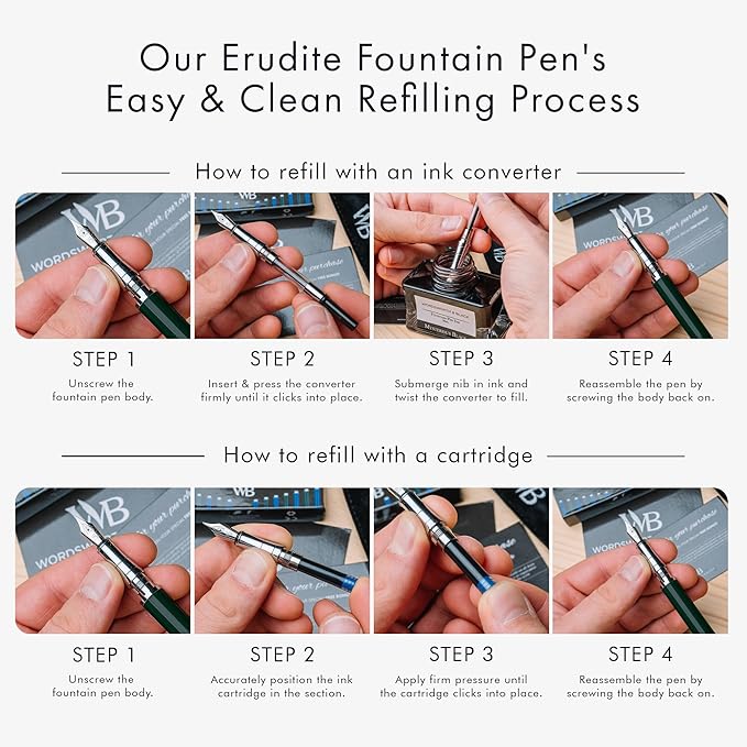 - ✒️Discover The All-inclusive Refillable Fountain Pen Set - Includes luxurious fountain pen, ink converter, 24 Pack Ink Cartridges, and a Gift Pouch - ready to be gifted. Each calligraphy ink and fountain pen ink cartridges comes in a plastic re-closable case and will last you at least 2 weeks of regular use. With every order is a complete instruction booklet for your Wordsworth and Black Pen Set. All the information you'll need to get started using and enjoying your luxurious writing tool!