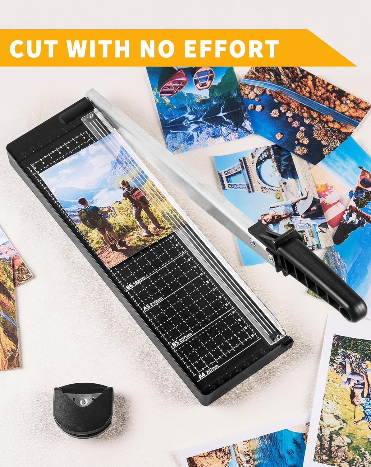 - [POWERFUL 8-SHEET CAPACITY] This guillotine paper cutter slices through 8 sheets effortlessly (16 lbs/11.7 inch paper). Cutting fewer sheets at a time extends the blade's lifespan, saving you money. Perfect for crafting, it handles printer paper, sticker sheets, pictures, labels, and cardstock like a pro