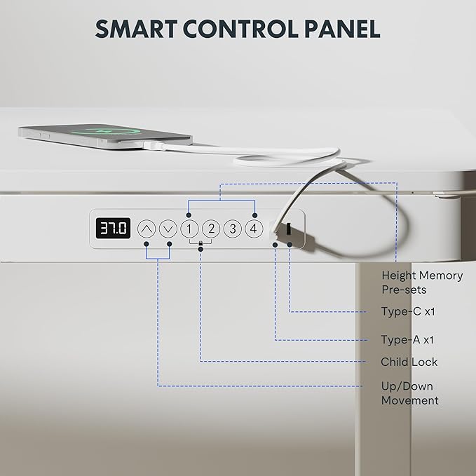 - Embedded Multiple Functions: This standing desk comes with four programmable height presets, making it easy to save your preferred heights. a child lock button helps prevent accidental touch. Charge up to three devices with integrated USB ports without mess & hassle. (Note: USB ports may pause charging while adjusting desk height, Laptop charging is not supported)