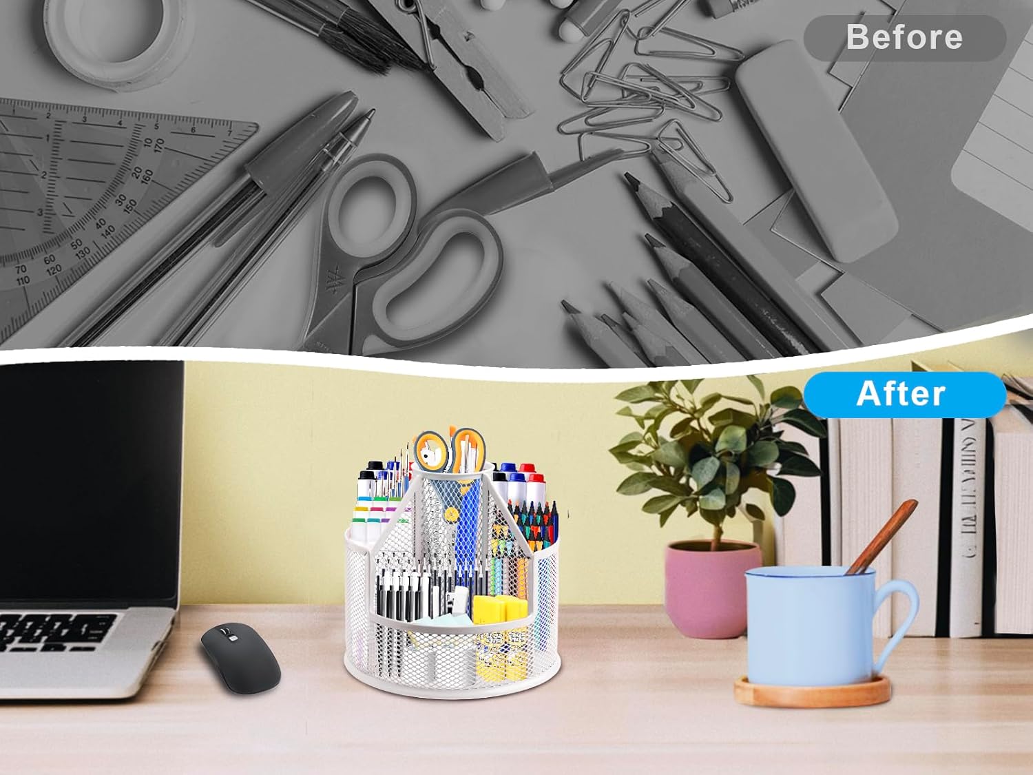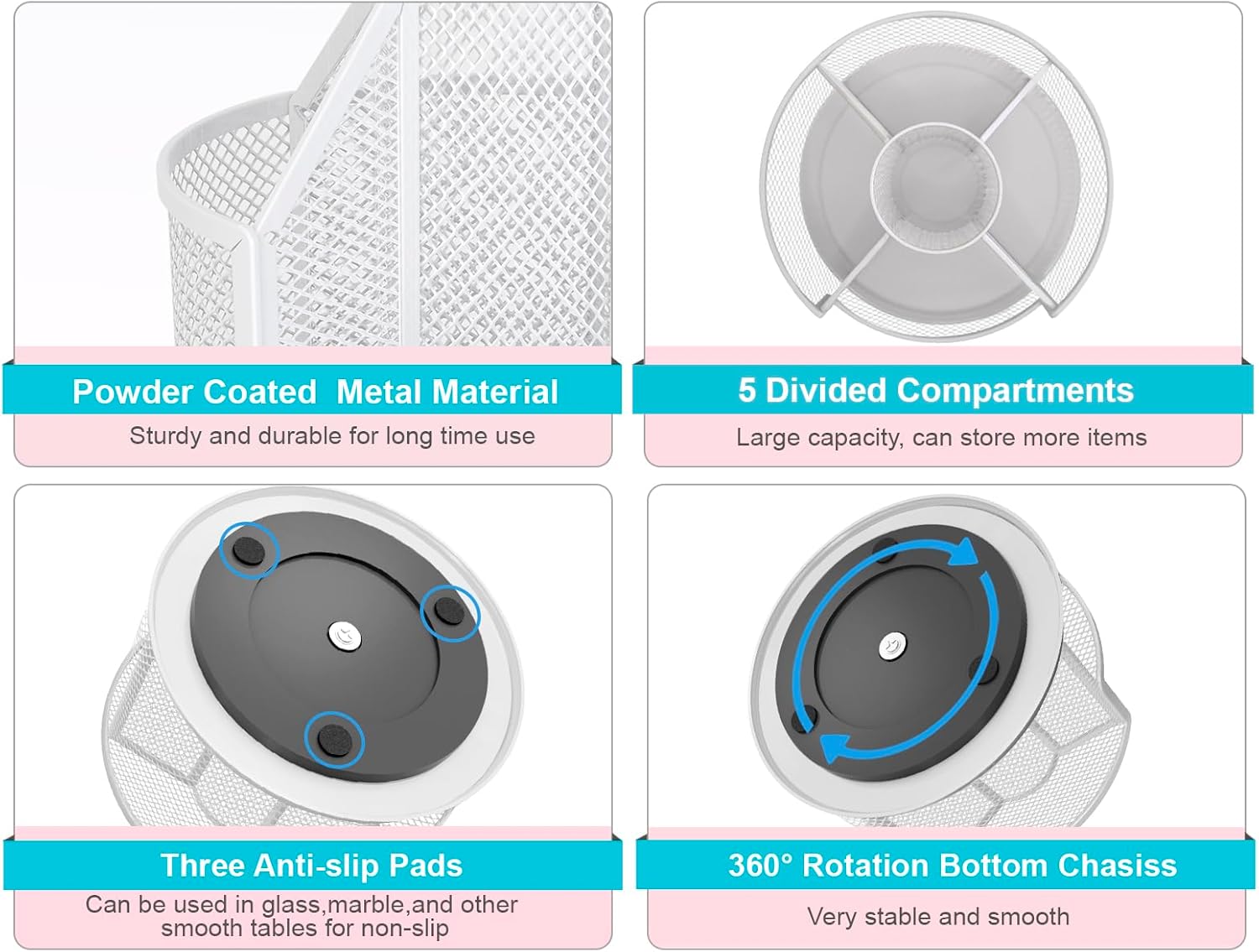 - Sturdy Rotating Design This desk pencil holder has a 360-degree rotation of chassis with reinforced anti-skid pad, you can rotate to your front at any time to access items at the easiest angle Cute Metal Design This desk pen holder is made of premium metal materials and adopts Powder Coated technology to maintain an excellent glossy and dazzling color, wear resistance, rust resistance Ultra-Large Capacity This desk pen organizer has 5 separate compartments to maximize space, which store a wide variety of items, perfect for paintbrushes, colored pencil, markers, office supplies and desk suppliers