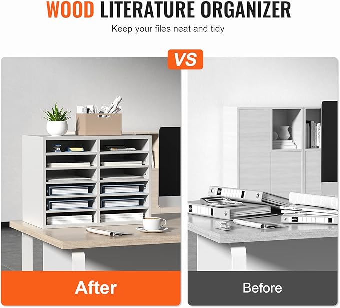 - Maximize Your Space: Say goodbye to cluttered desktops with VEVOR 20.4''x12''x16.1'' wood literature organizer. It has 12 compartments in total, arranged in 6 rows and 2 columns. You'll have ample space to store and organize books, documents, magazines, papers, and other materials. Keep your workspace neat and tidy with ease.