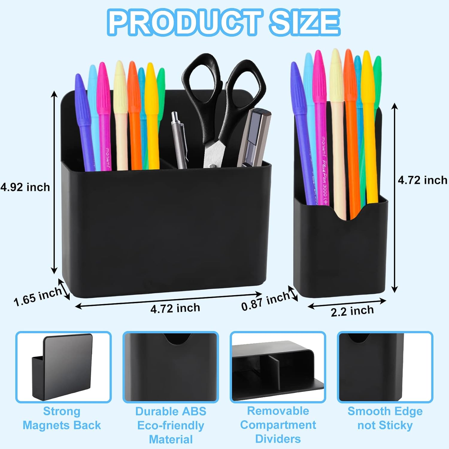 - Simple and Practical:Our magnetic pen holders are suitable for holding pens, pencils, dry erase markers, erasers, rulers, children's scissors and other office, home or school supplies. Also can be served for refrigerator, whiteboard, locker or other metal surfaces.Keep your stuff always organized!