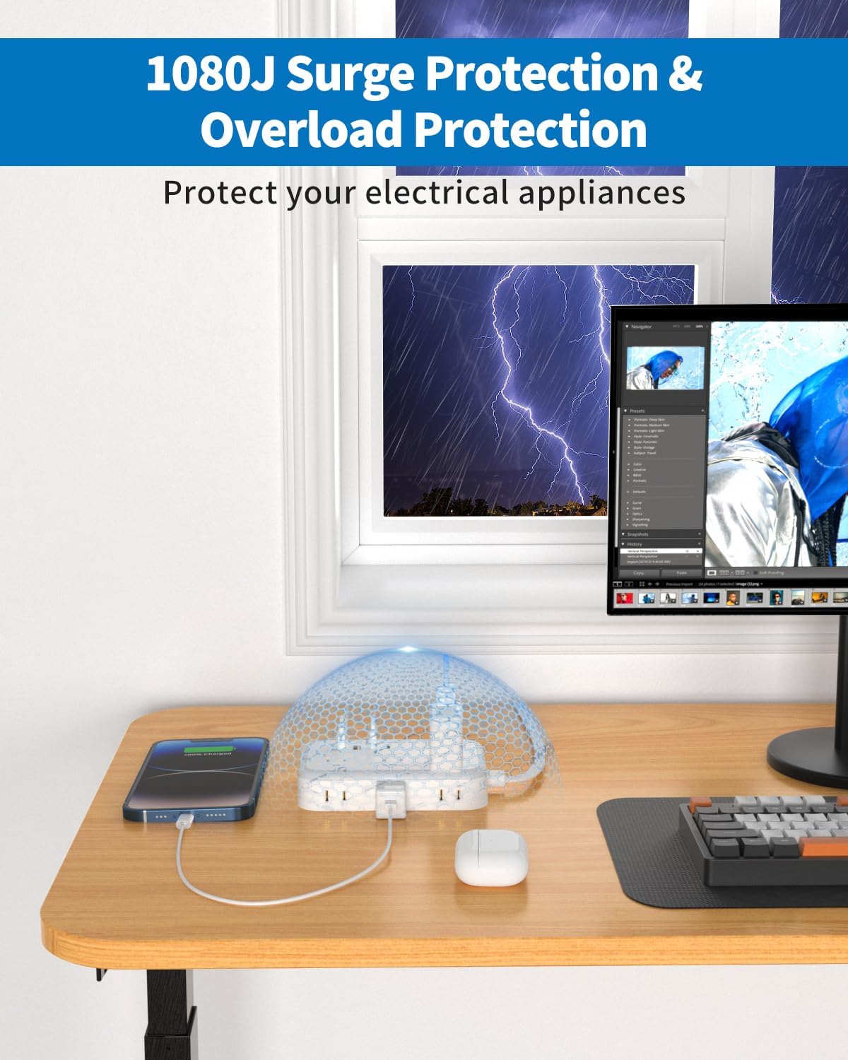 - 【Reliable Surge Protection & Overload Protection】- The surge protector with overload protection protects your electrical appliances from lighting, surges, or spikes. The minimum energy-absorbing capacity of 1080 Joules. The flat extension cord with built-in multiple security modules safeguards your electronic devices from overload and over-current/over-charge/short circuit/over-heated.