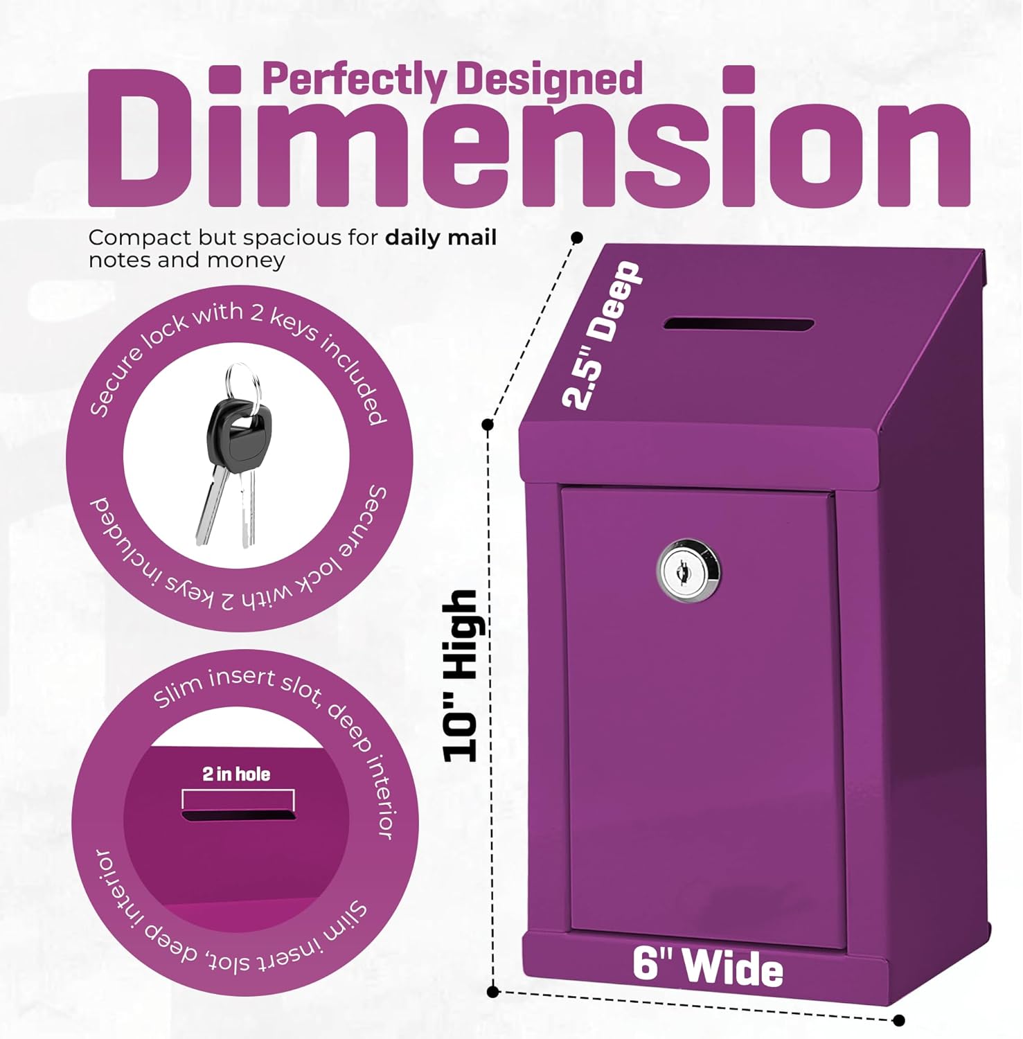 Metal Donation Box-Suggestion Box with Slot and lock-Cash Lock box for Money-Secure Drop Box-Comment and ballot voting box-comes with pre-drilled holes for easy wall mounting 10 X 6 X 2.5"(Purple)