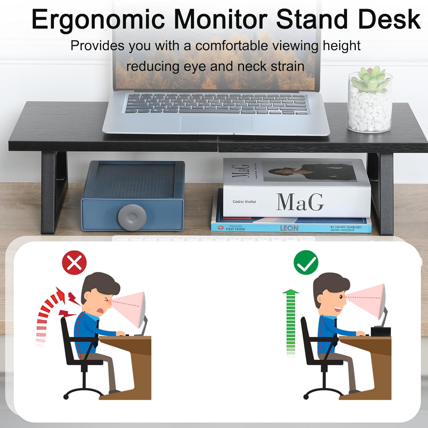 - 【Storage Space Underneath】The Stand made of thickened steel frame can hold 150Ibs, strong and sturdy. It can storage your keyboard, cords, pens, office supplies, etc, and makes cable management pretty easy. Ergonomic design, relieves eyesight and back fatigue during work.