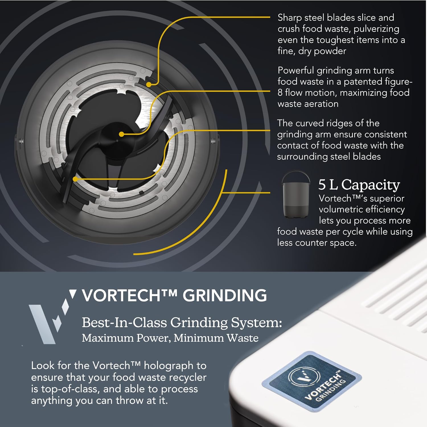 - INNOVATIVE VORTECH SYSTEM: The Eco 5βs Vortech(TM) patented grinding system can grind what others can't. Toss in your pits, peels, bones, leftovers! Vortech's efficiency means the FoodCycler indoor electric composter alternative consumes less power than your average clothes dryer.