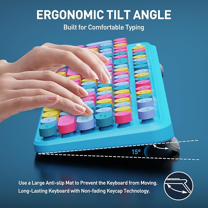 - 【 Wireless Keyboard Mouse Combo】The inspiration for these cute rounded keys comes from vintage typewriters offering you visual enjoyment and a retro feeling to type. With colorful key caps, make you be distinctive in the office and work full of fun.