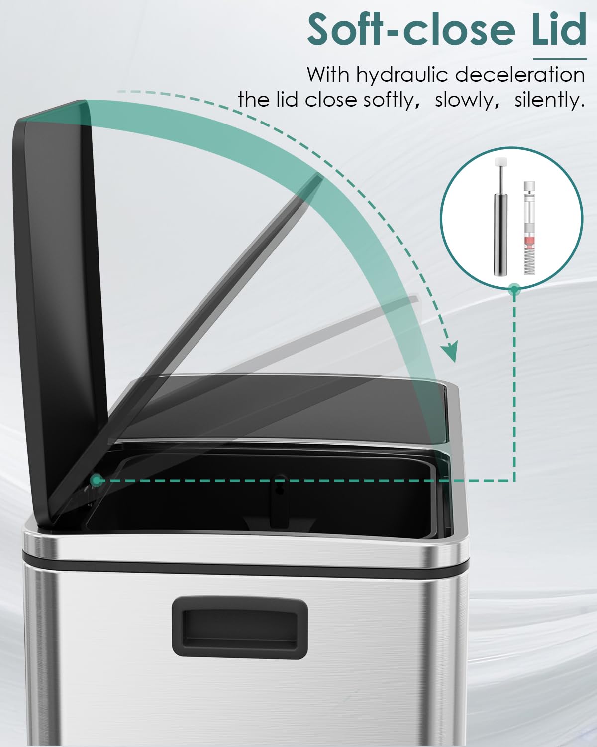 - 2*8 GALLONS COMPARTMENTS: Trash can has two independently compartments for trash and recyclables, making it easy to sort waste.