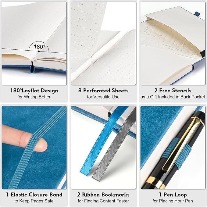 - 【User-Centered Design】❶ Add 2 subtle markers on the pages to assist with QUICK PAGE LAYOUT, allowing you to easily locate the center of rows and columns without counting every time; ❷ Include all the essential features of a perfect dot grid journal, such as 8 perforated sheets, 2 bookmarks, elastic closure band, pen holder, and back pocket; ❸ BONUS - 2 stencils are being gifted to you to create your ideal bullet point journal.