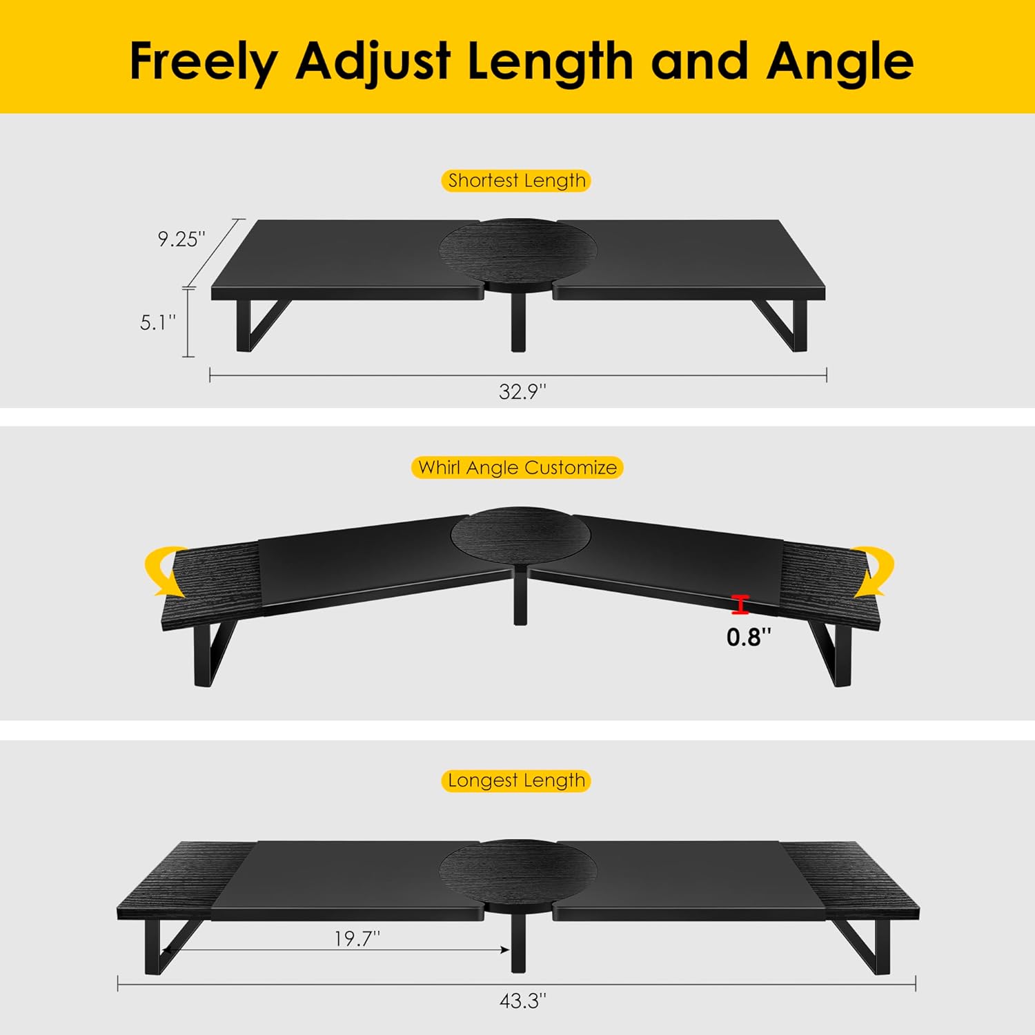 - Adjustable Length & Angle:You could adjust the length of large computer stand for desktop monitor from 32 to 55 inch, which could be adjustable to accommodate 1-2 monitors/laptops to meet your office needs. Wiht the circular turntable in the middle, you could move monitor riser for 2 monitors at any angle to customize a comfortable position.
