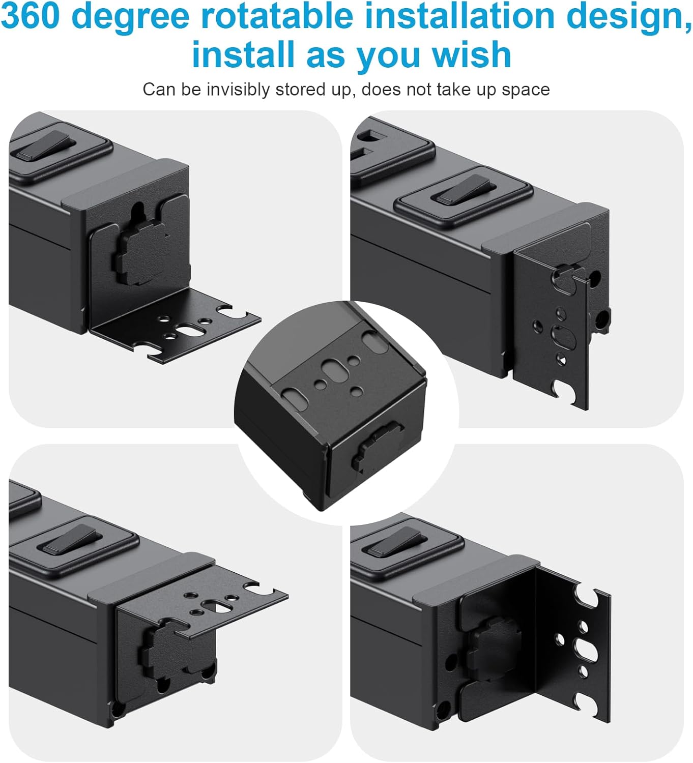 HHSOET Metal 360° Rotating Mountable Power Strip, 8 Outlet Gaming Table Mounted Outlet Strip, Heavy Duty Wall Mount Surge Protector with Switch, 15A 125V 1875W, 6ft Power Cord.(Black)