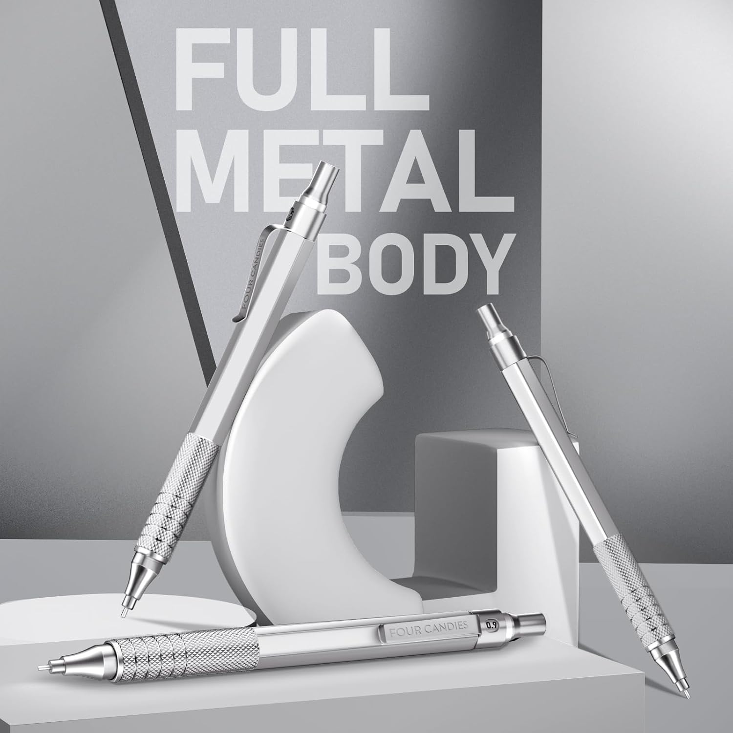 Four Candies 0.9mm Mechanical Pencil Set with Case, 3PCS Metal Artist Lead Pencil with 8 Tubes (480PCS) HB Lead Refills, 3 Erasers, 9 Eraser Refills For Engineer Art Writing Drafting, Silver