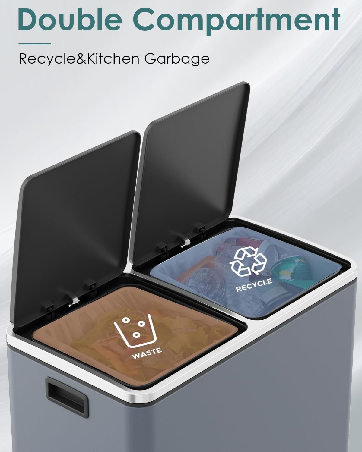- 2*8 GALLONS COMPARTMENTS: Trash can has two independently compartments for trash and recyclables, making it easy to sort waste.
