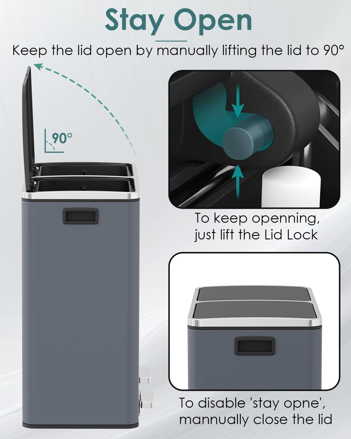 - GENTLE&SEALED LIDS: 60L trash lid is designed with ABS hydraulic deceleration to close gently and silently, minimizing noise and preventing it from slamming shut. Sealed lids fit tightly to block unpleasant odors, keeps your home smelling fresh and clean.