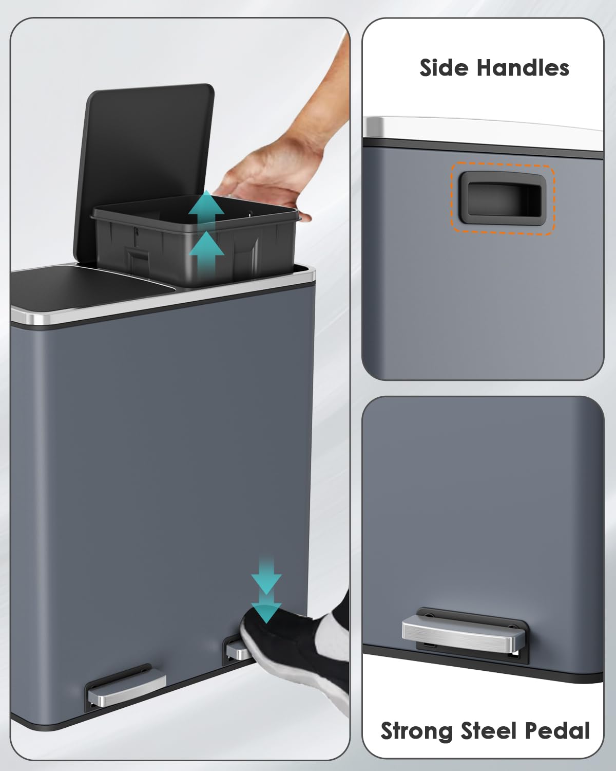 - WIDEN PEDAL&SIDE HANDLES: Dual trash can includes 2 non-slip metal pedals that can open 2 lids individually, free your hands and cleaner. With 2 portable side handles, we can move it easily.