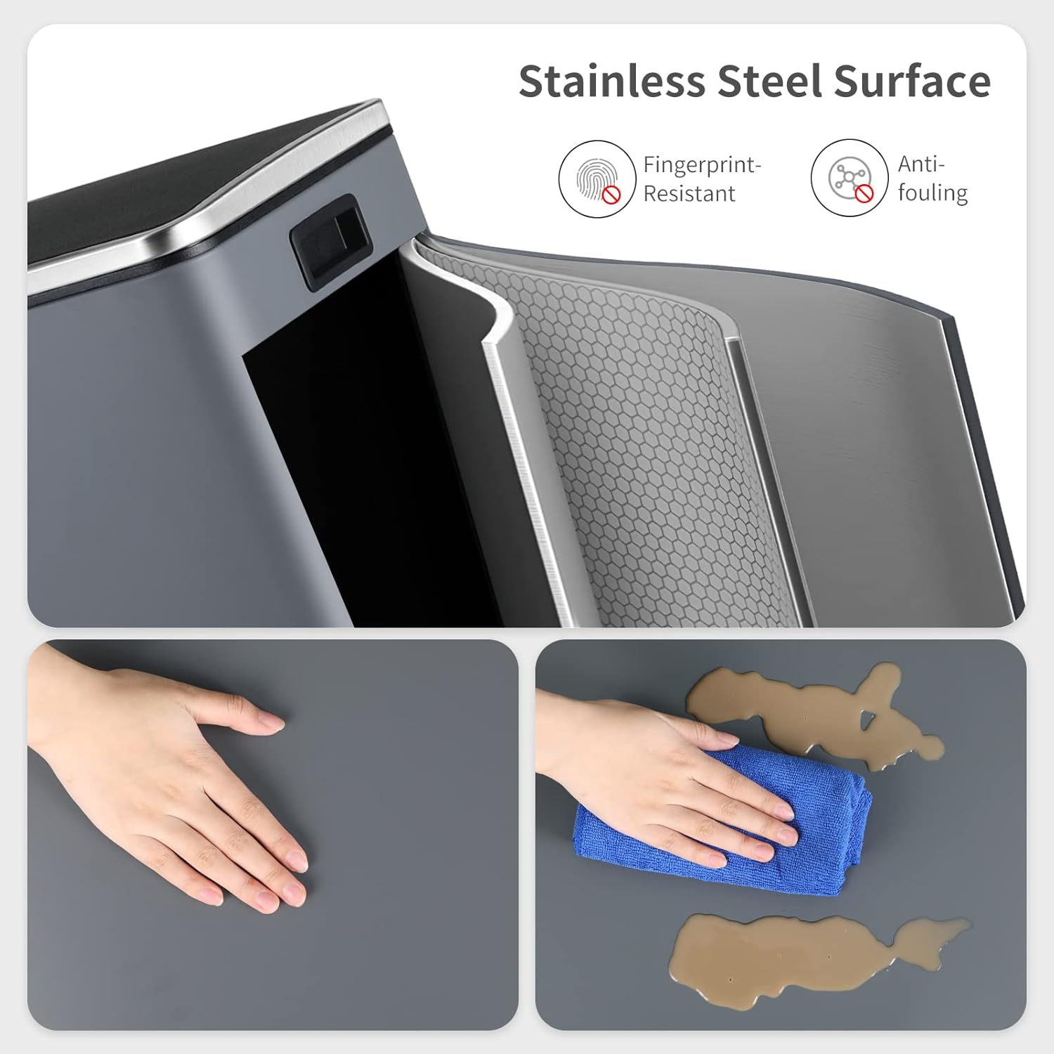 - DURABLE&STYLISH: Trash can is made of durable and fingerprint-proof stainless steel, which is easy to clean and maintain. High-quality thick 410 stainless steel has a capacity of 16 Gallon/60-Liter, perfect for homes, offices, and other spaces with high waste generation.