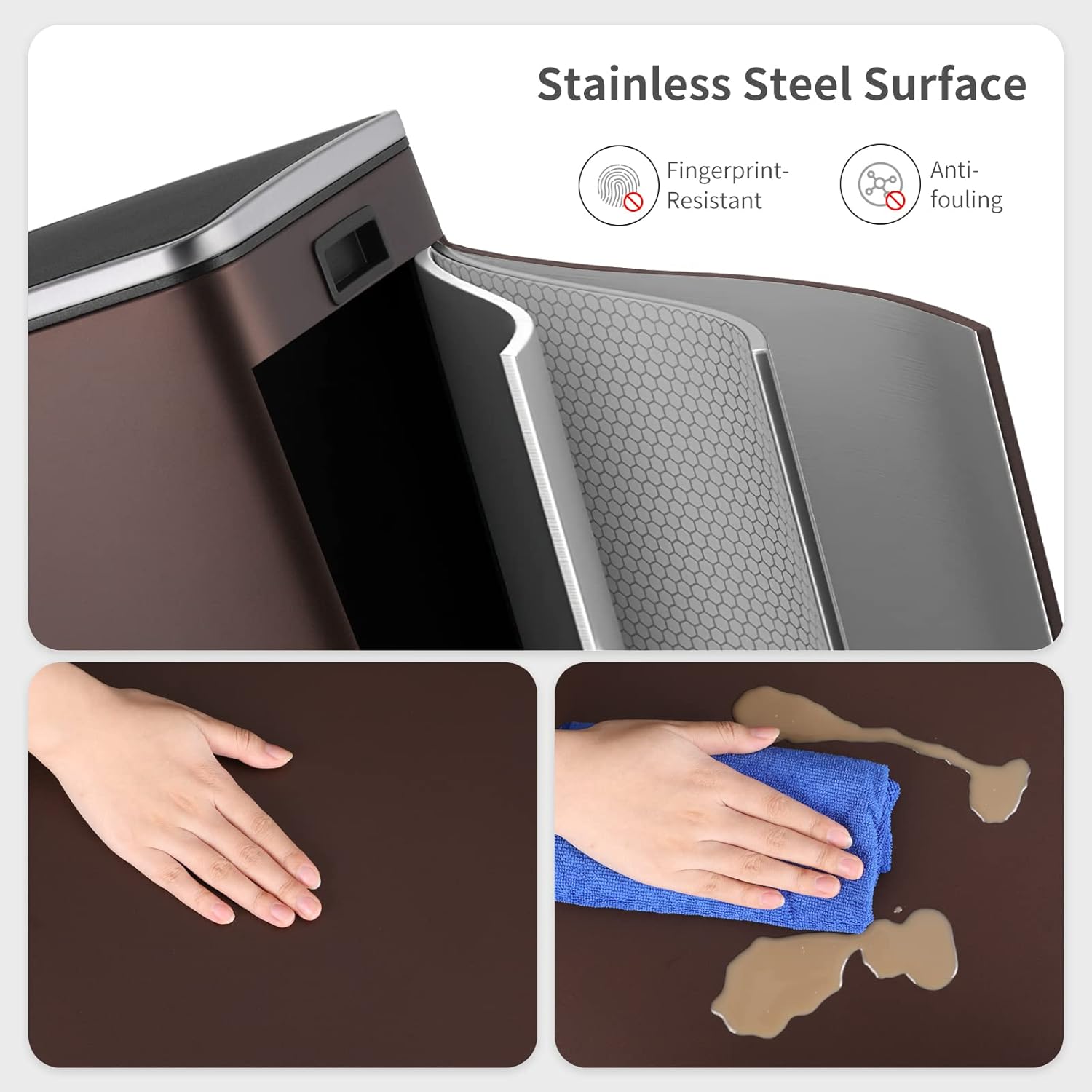 - DURABLE&STYLISH: Trash can is made of durable and fingerprint-proof stainless steel, which is easy to clean and maintain. High-quality thick 410 stainless steel has a capacity of 16 Gallon/60-Liter, perfect for homes, offices, and other spaces with high waste generation.