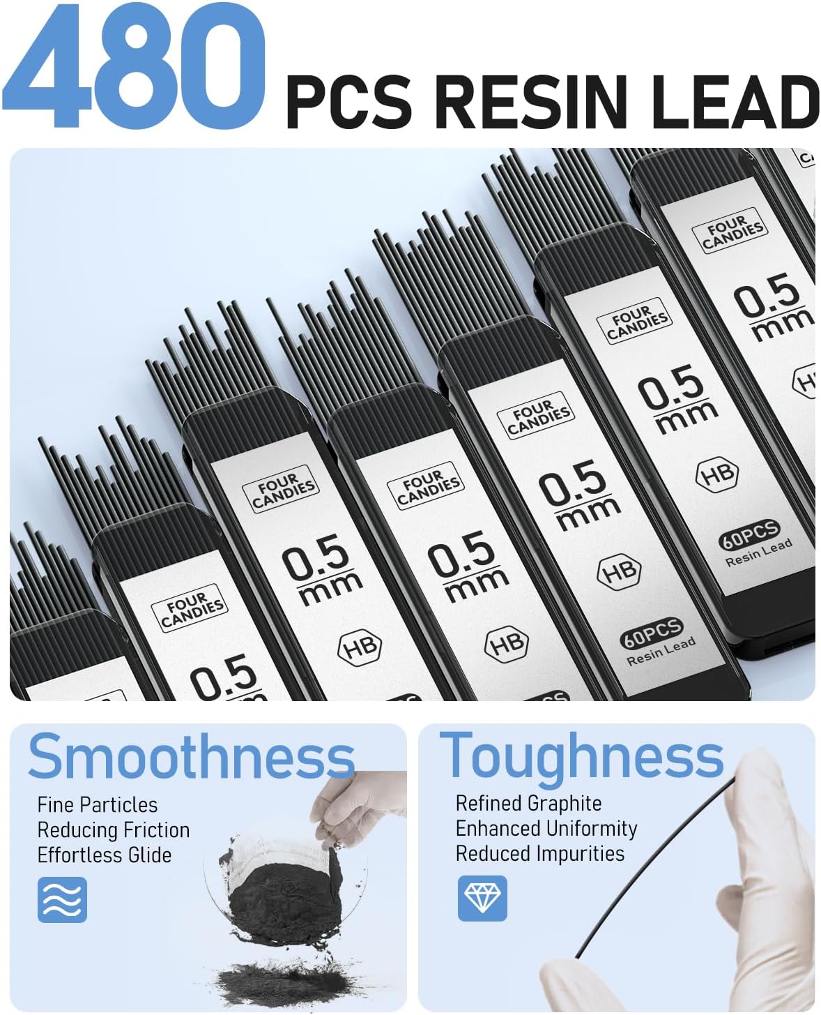 - 480PCS Resin Lead: 8 tubes of 60pcs super capacity leads. A more durable resin lead which doesnβt require sharpening and is not easy to break at the tip or break in the shaft, provides ultra-smooth writing and clear dark lines.