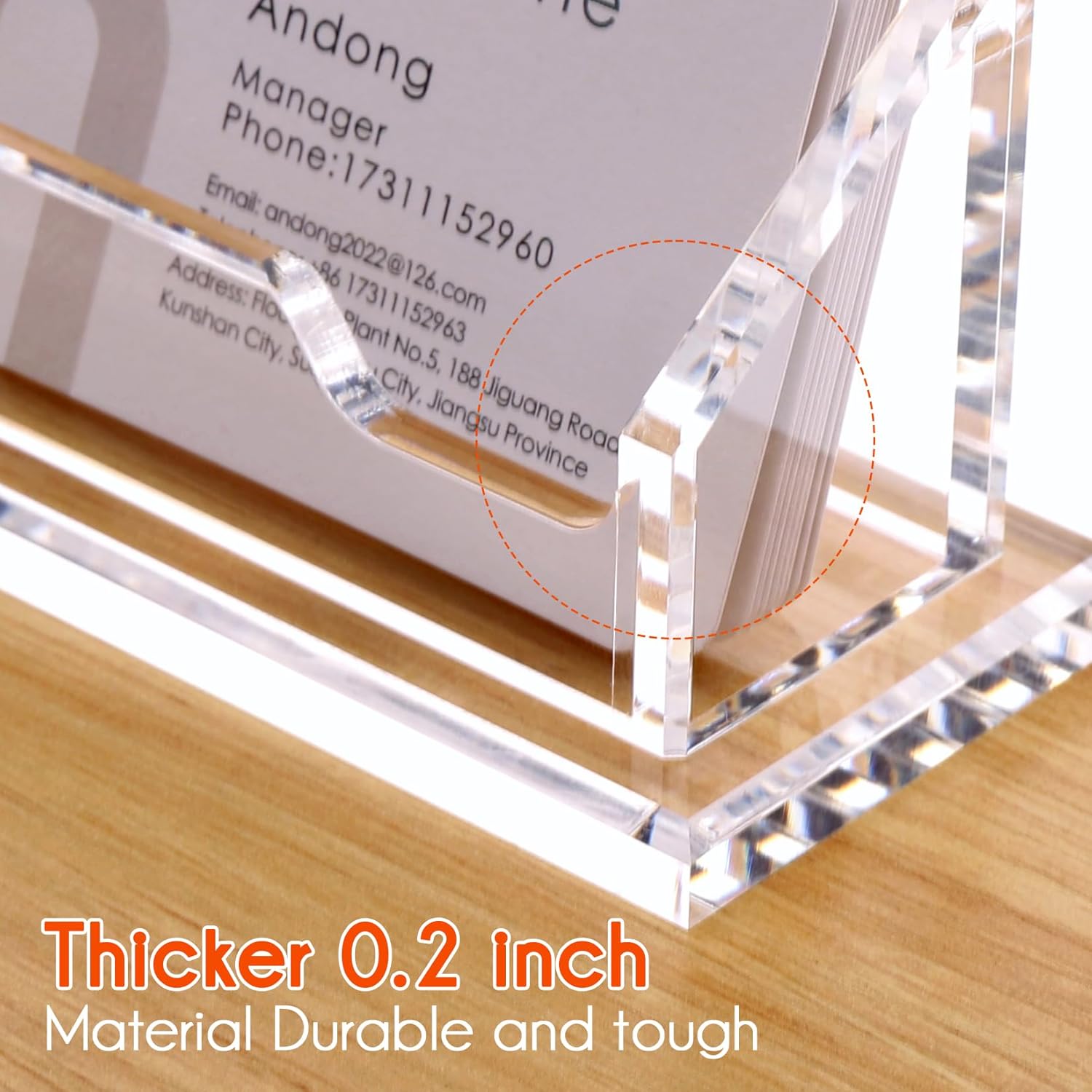 - STURDY BUSINESS CARD HOLDER:Our business card organizer size is L4.8 x W2.67 x H2.83 inches,8mm thickened base,5mm(0.2 inches) thickness acrylic material. Weight: 4.6 ounces.High-quality thickened acrylic name card holder, crystal texture ,sturdy and durable, smooth edges, no hand injury, integrated,no assembly required,easy to clean