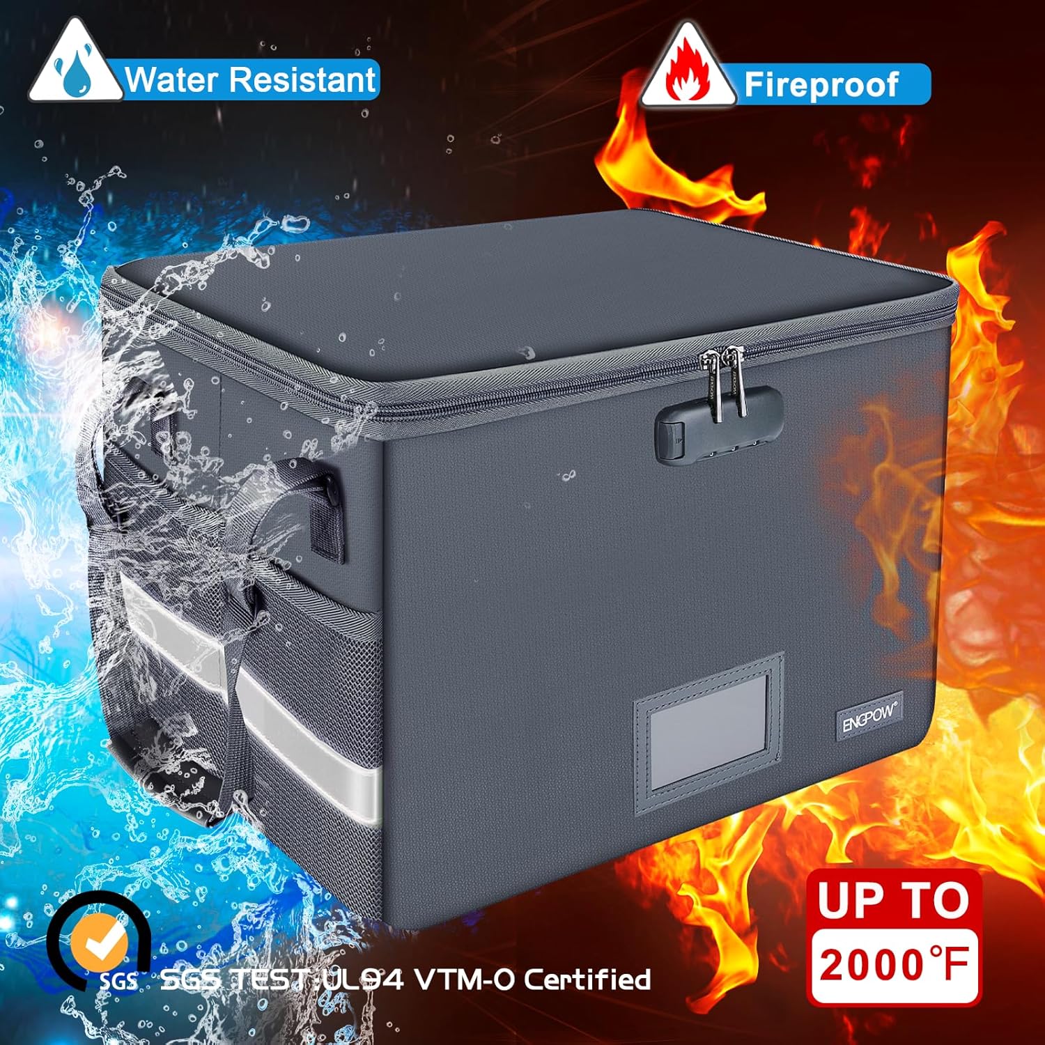 - Fireproof and water-resistant: Fireproof lock box is made of double layered non-itchy silicone coated fiberglass which stands up the temperature up to 2000β.It has been passed by SGS TEST(UL94 VTM-0 Certified).Fireproof file box is not only fireproof but also high water resistant in case it gets wet for any reason.Nothing is completely foolproof, but added protection is always a good idea.