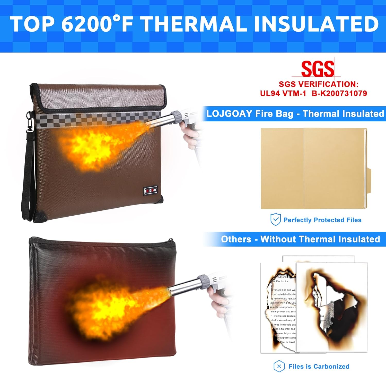 - 6200°F Unmatched Fireproof: This fireproof document bag upgrated to 9 Layers of Heat Insulated function materials, which has passed global flammability standards (US labs) and vertical burning tests (SGS UL94 V-1) and can withstand temperatures up to 6200°F, it is far exceeding typical fire temperatures.