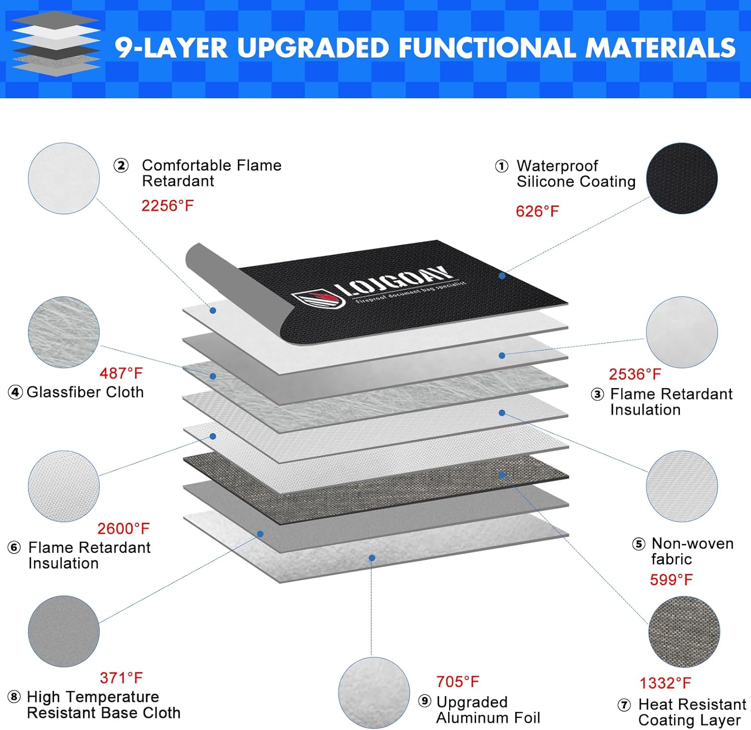 - 360° Fireproof and Double Safety Design: This LOJGARY fireproof bag not only upgrated to 9-layer function material structure of fire protection and heat insulated but also upgrated the zipper to professional fireproof and water resistant to make sure your valubles Double Safety; The fireproof money bag for cash is sewn with flame-retardant thread and fireproof hemming, to prevent fire from damaging the fireproof bag from the edge, it is closure by fireproof flap which make the fire proof money bag for cash 360°fire resistant.