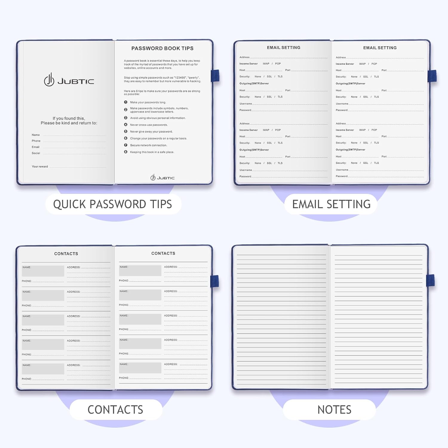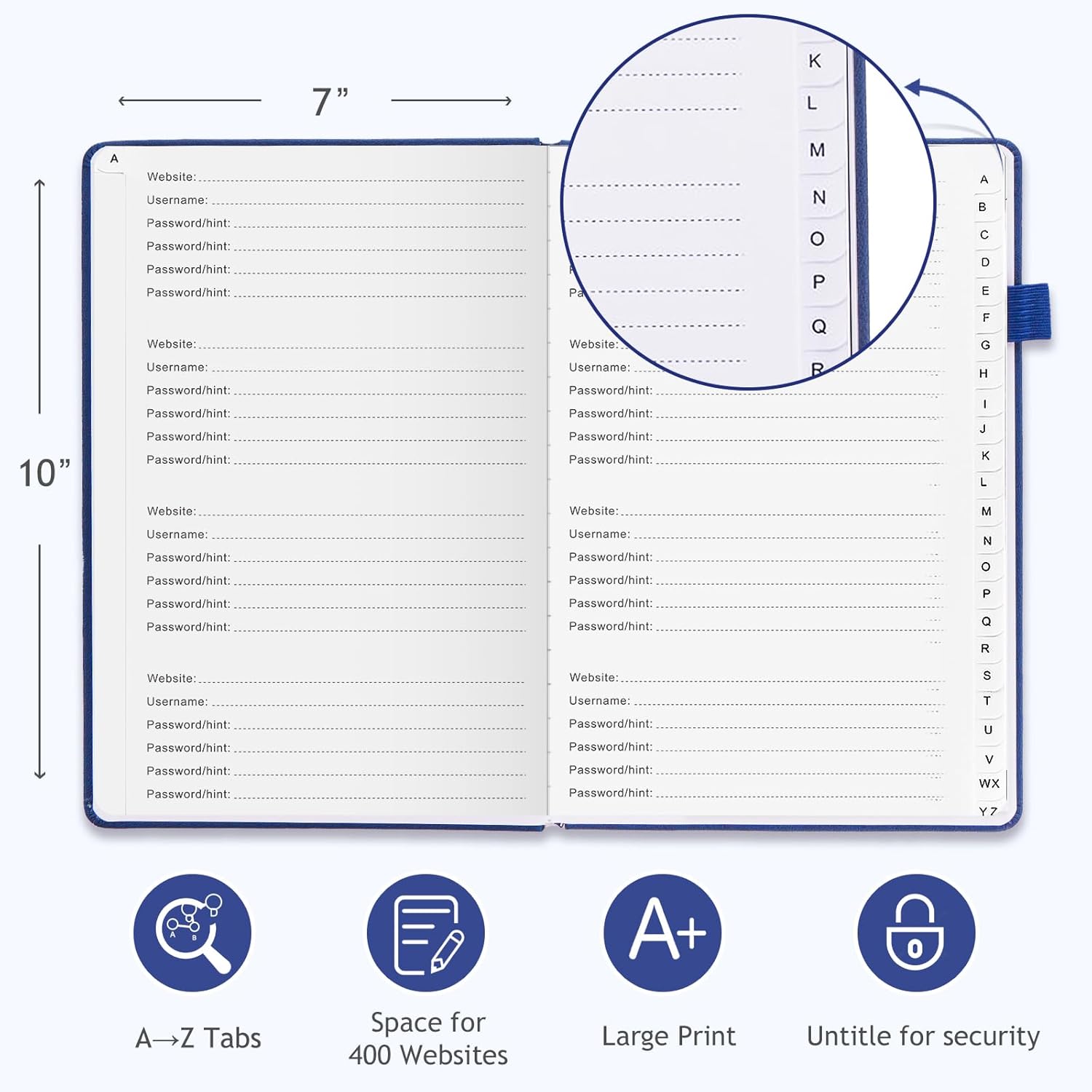 JUBTIC Password Book with Individual Alphabetical Tabs, 7"x10" Internet Password Keeper Book for Seniors, Password Notebook and Organizer/Notes Section, Navy Blue