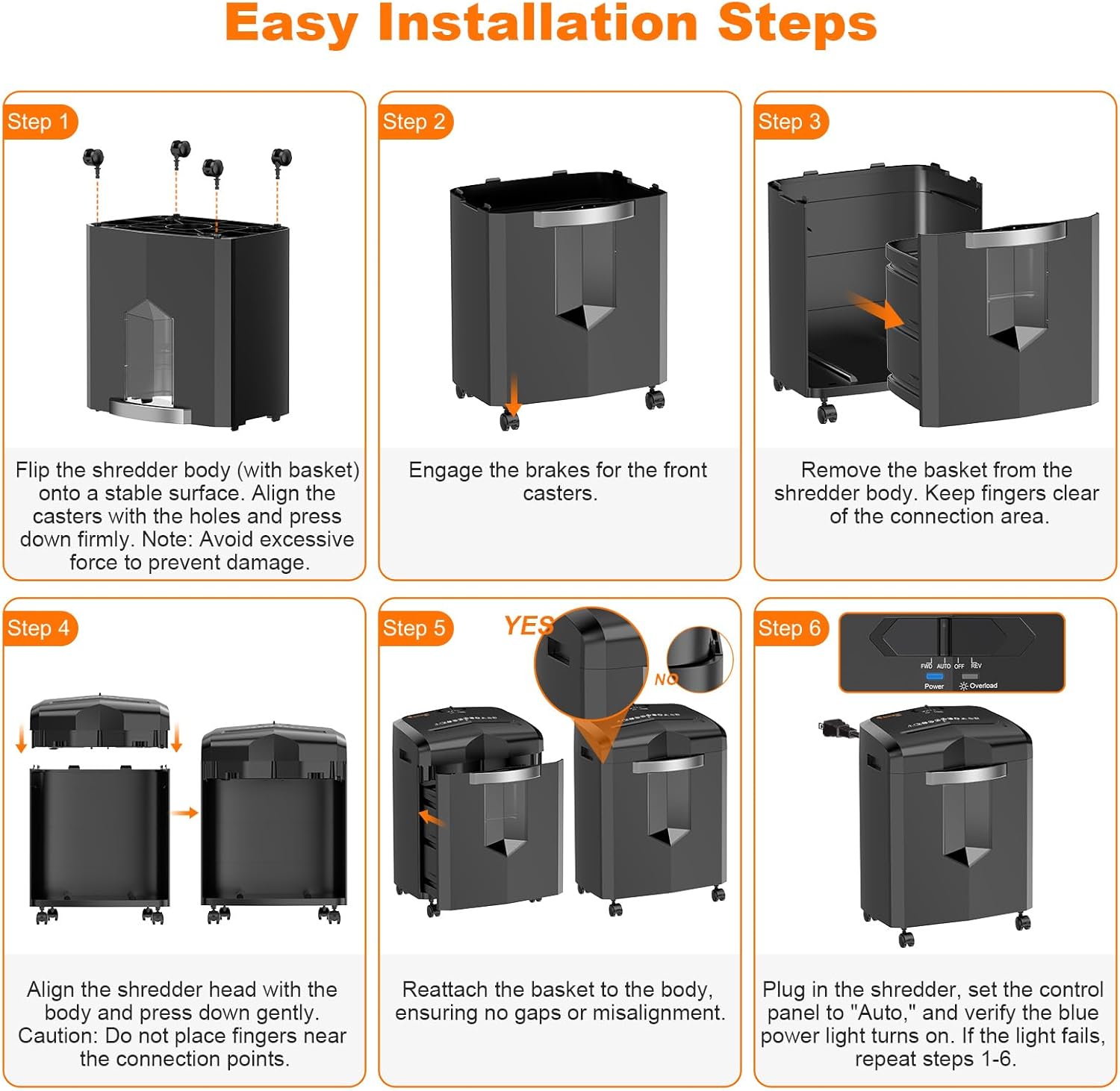 - Step 1: Flip the shredder body (with basket) onto a stable surface. Align the casters with the holes and press down firmly. Note: Avoid excessive force to prevent damage. Step 2: Engage the brakes for the front casters. Step 3: Remove the basket from the shredder body. Keep fingers clear of the connection area. Step 4: Align the shredder head with the body and press down gently. Caution: Do not place fingers near the connection points. Step 5: Reattach the basket to the body, ensuring no gaps or misalignment. Step 6: Plug in the shredder, set the control panel to "Auto," and verify the blue power light turns on. If the light fails, repeat steps 1β6.