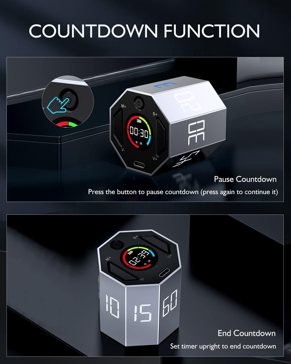 - OCTAGONAL GRAVITY TIMER - FLIP TO SET TIME: [upgrade] Pomodoro timer 2.0 has 8 preset countdowns (3/5/10/15/20/30/45/60 minutes), Just flip up any side of the Pomodoro timer to set your countdown, you can set it with one hand when you are busy. Also supports custom countdown(the maximum time is 99:59) which widely suits your daily study, fitness yoga, work meetings, kitchen cooking, etc.