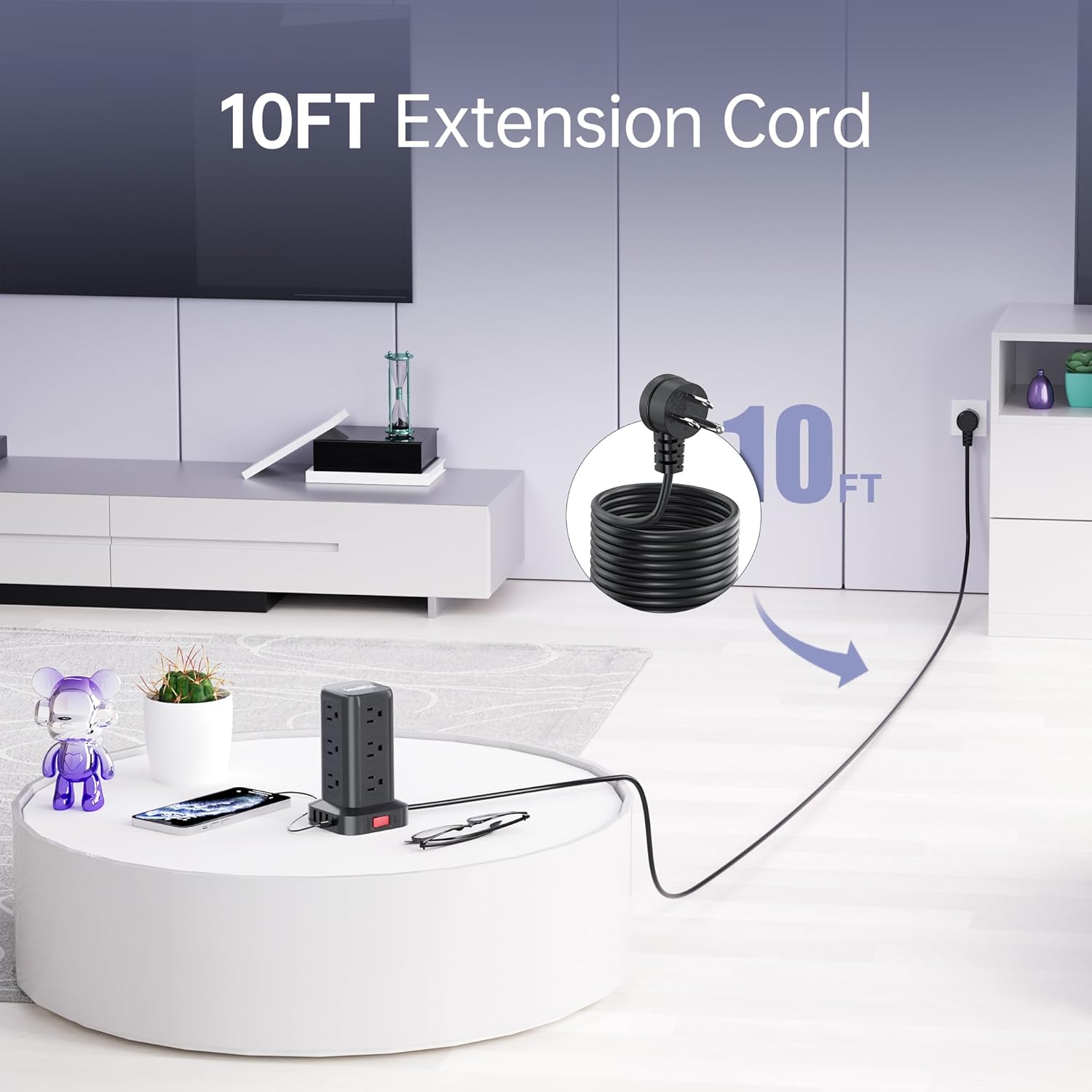 - 【10FT Extension Cord with Multiple Outlets 】The 10FT upgraded extension cord with multiple outlets is made of pure copper. Reinforced design at the junction of the stand of power strip tower and the wire head. To protect the terminal from wear and tear. Environmental protection and fire-resistance PC shell with flame retardant at 1382℉ makes it more safe and longer lifetime.