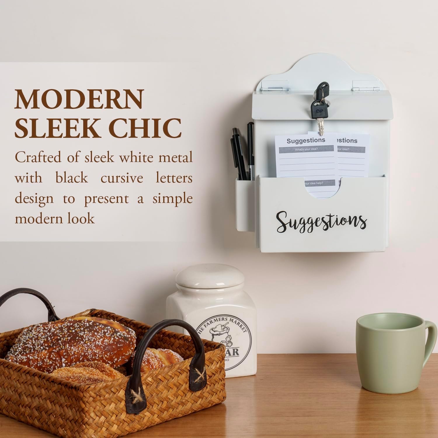 MyGift Classic White Metal Suggestion Box with Cursive Suggestions Lettering, Wall Mounted or Tabletop Comment Box with Lock, Keys, Paper Sheet and Pen Holder Slots