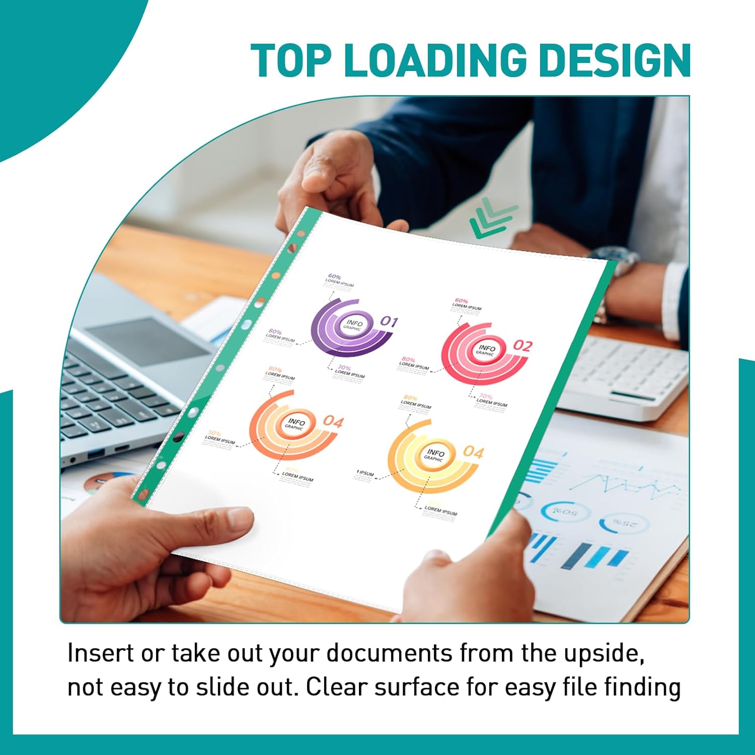 - TOP LOADING DESIGN: The convenient top loading design allows for easy insertion and removal of sheets, and the various pre-punched holes allow our clear binder sleeves to be used with file, photo, or recipe binders