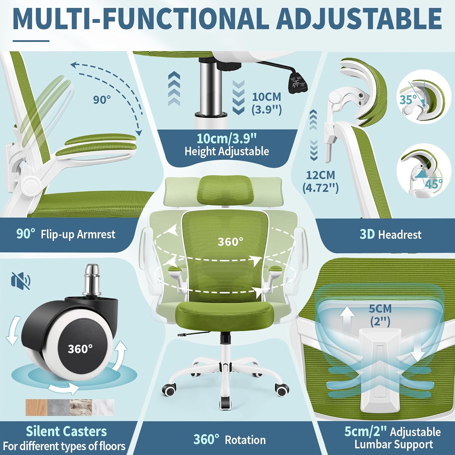 FelixKing Ergonomic Office Chair, Adjustable Lumbar Support, Swivel Chair with HighBack and Armrest, Adjustable Height Gaming Chair, Avocado Green