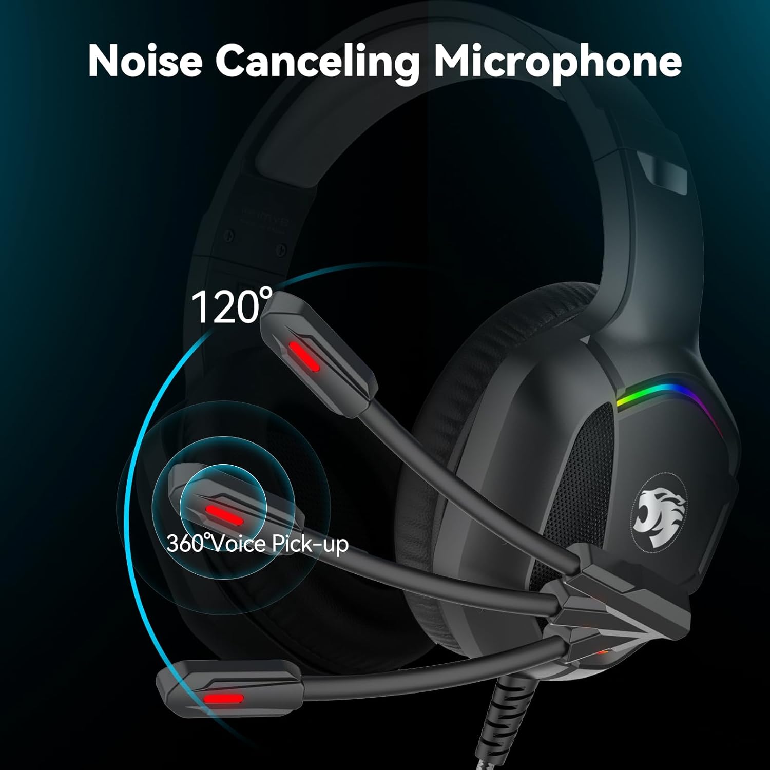 Gaming Headset with Microphone for Pc, Xbox One Series X/s, Ps4, Ps5, Switch, Stereo Wired Noise Cancelling Over-Ear Headphones with Mic, RGB, for Computer, Laptop, Mac, Nintendo, Gamer (Black)