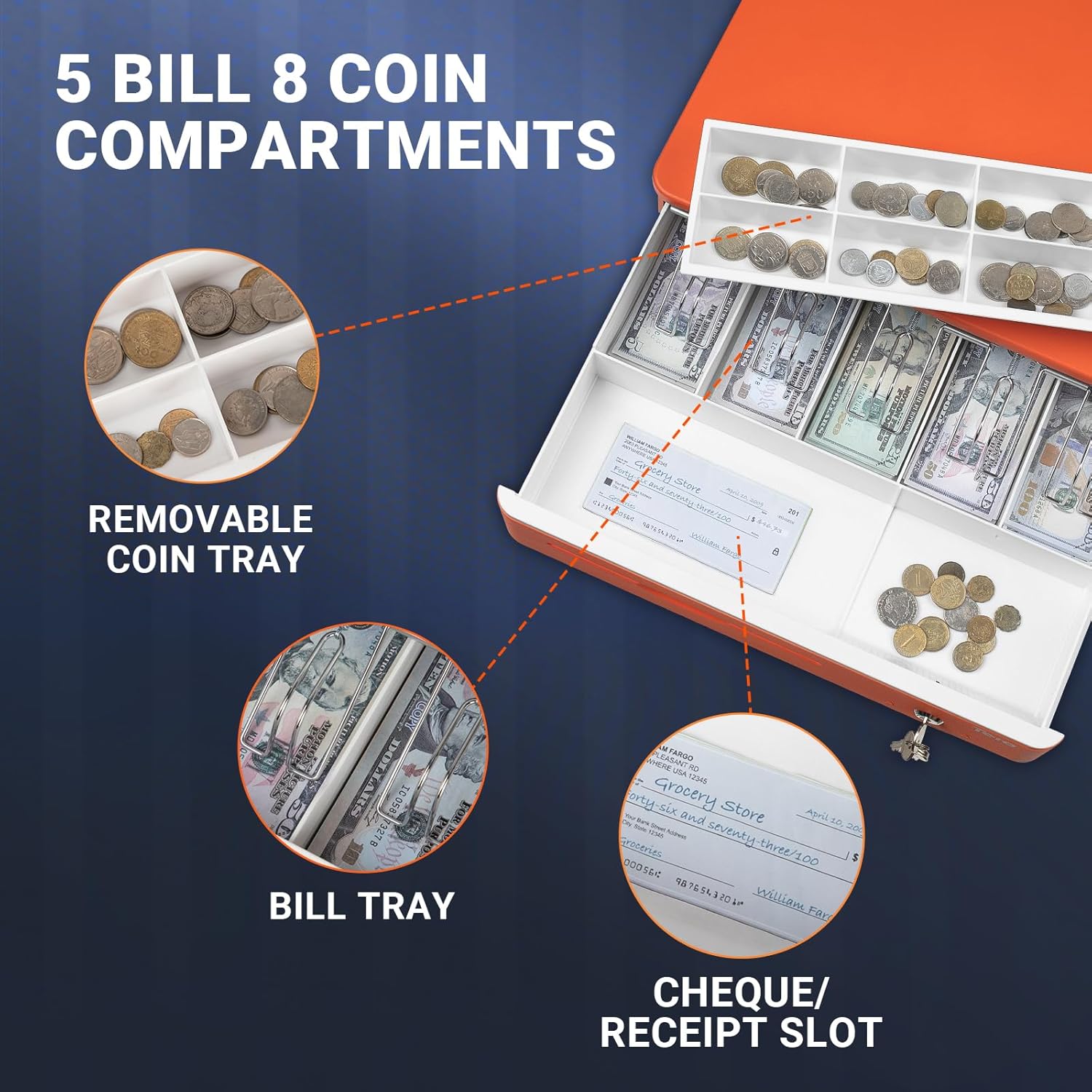 - γ5 Bill 8 Coin Compartmentsγ The money box has a built in cash tray that comes with a removable coin tray to maximize the partitions to 5 bill slots and 8 coin slots. The front panel has 1 media compartment for large bills, cheques, and receipt storage without opening the drawer.