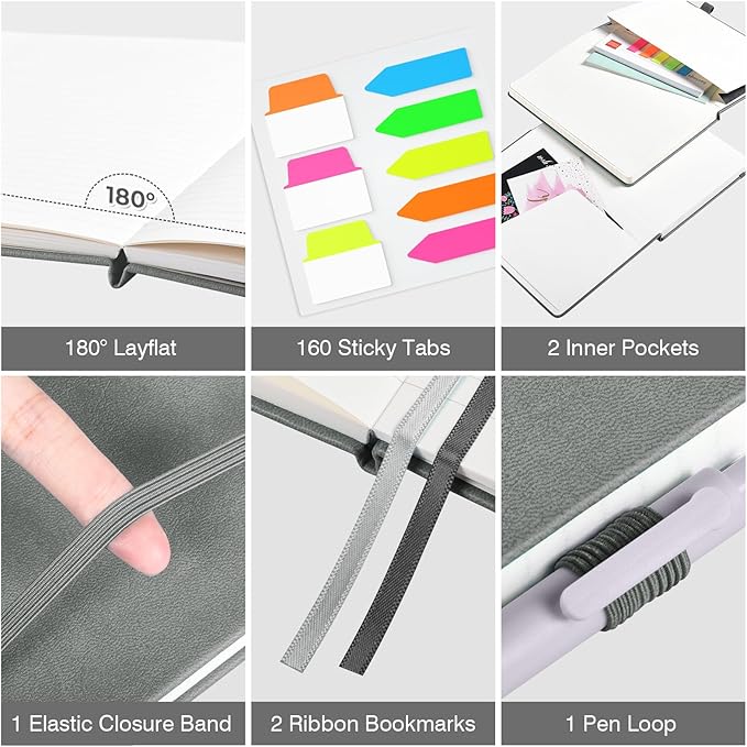 - 【Thoughtful Accessories】Our hard cover notebook comes with a range of practical accessories to enhance your writing experience. Each notebook includes 2 pockets, 2 bookmark ribbons, 1 elastic band, 1 pen loop. And as a bonus, each set of notebooks comes with 3 pens that match the color of the notebooks, along with 160 PCS colorful index & tabs stickers.