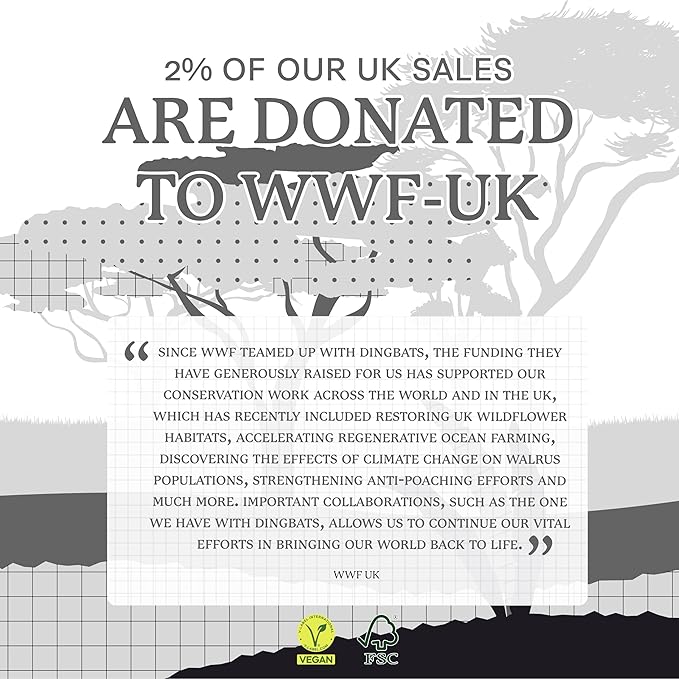 - SUSTAINABLY SOURCED, ENVIRONMENTALLY CONSCIOUS: Join us in our commitment to sustainability. Crafted from recyclable materials and FSC certified paper, our notebooks are a sustainable option and proudly Vegan Certified. Additionally, for our UK sales, Dingbats* Notebooks Ltd donates 2% of its revenue to WWF-UK, a charity registered in England and Wales (1081247).