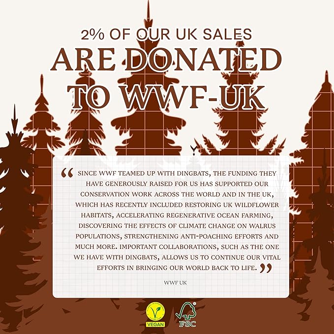 - SUSTAINABLY SOURCED, ENVIRONMENTALLY CONSCIOUS: Join us in our commitment to sustainability. Crafted from recyclable materials and FSC certified paper, our notebooks are a sustainable option and proudly Vegan Certified. Additionally, for our UK sales, Dingbats* Notebooks Ltd donates 2% of its revenue to WWF-UK, a charity registered in England and Wales (1081247).