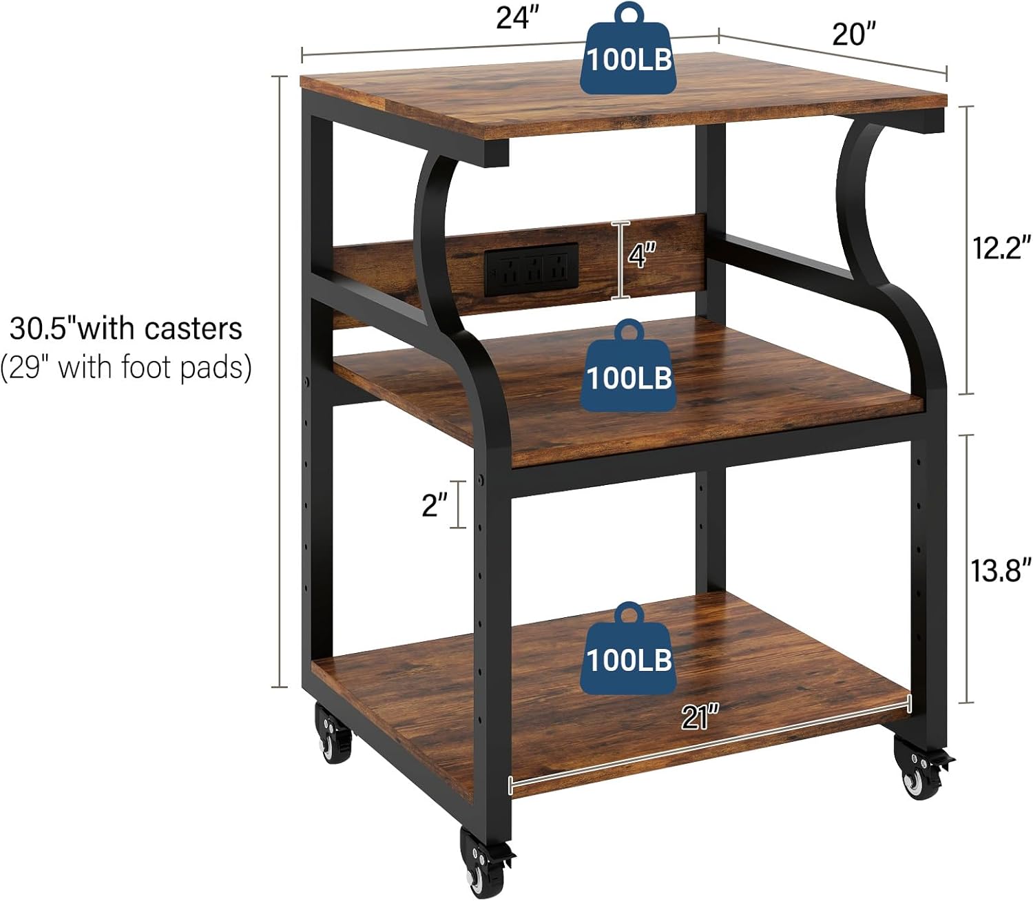 - 【Sturdy & Durable】This heavy duty printer stand supports 300 lbs in total. the powder-coated steel tube frame size is 1’’x1’’, and there is an extra load bearing tube under the top shelve , The solid construction,high quality particle board and industrial grade wheels make it quite a durable printer shelf that you can count on for years.