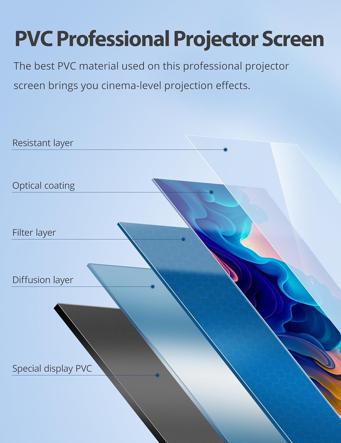 - 🎥Advanced PVC Material Projection Screen: Professional 1.5 gain PVC material + cinema-grade multi-layered projection screen. Our screen uses PVC, a professional-grade curtain material recognized as having the best projection effect, supplemented by four additional layers of polymer materials to achieve cinema-grade 1.5 gain reflective effect. 1080p effect projection, no color difference, 160° viewing angle, no creases.