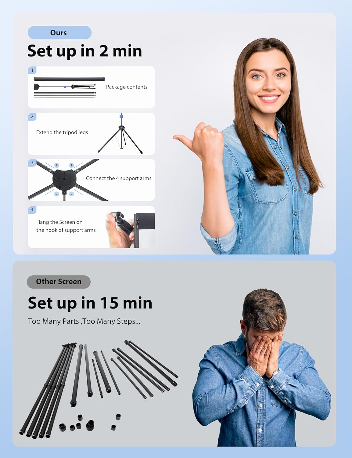 - 🥰Portable + Easy to Store: PVC material is generally used for professional-grade screens which are thick and unfoldable, so difficult to carry. Our screens take advantage of the detachability and foldability of the tripod and combine it with travel needs, retaining professional-grade screens while achieving portability.Only 3 steps, one person can install it in 2 minutes. Also, it can be easily disassembled and takes up only a small storage space. Comes with a bag for carrying out.