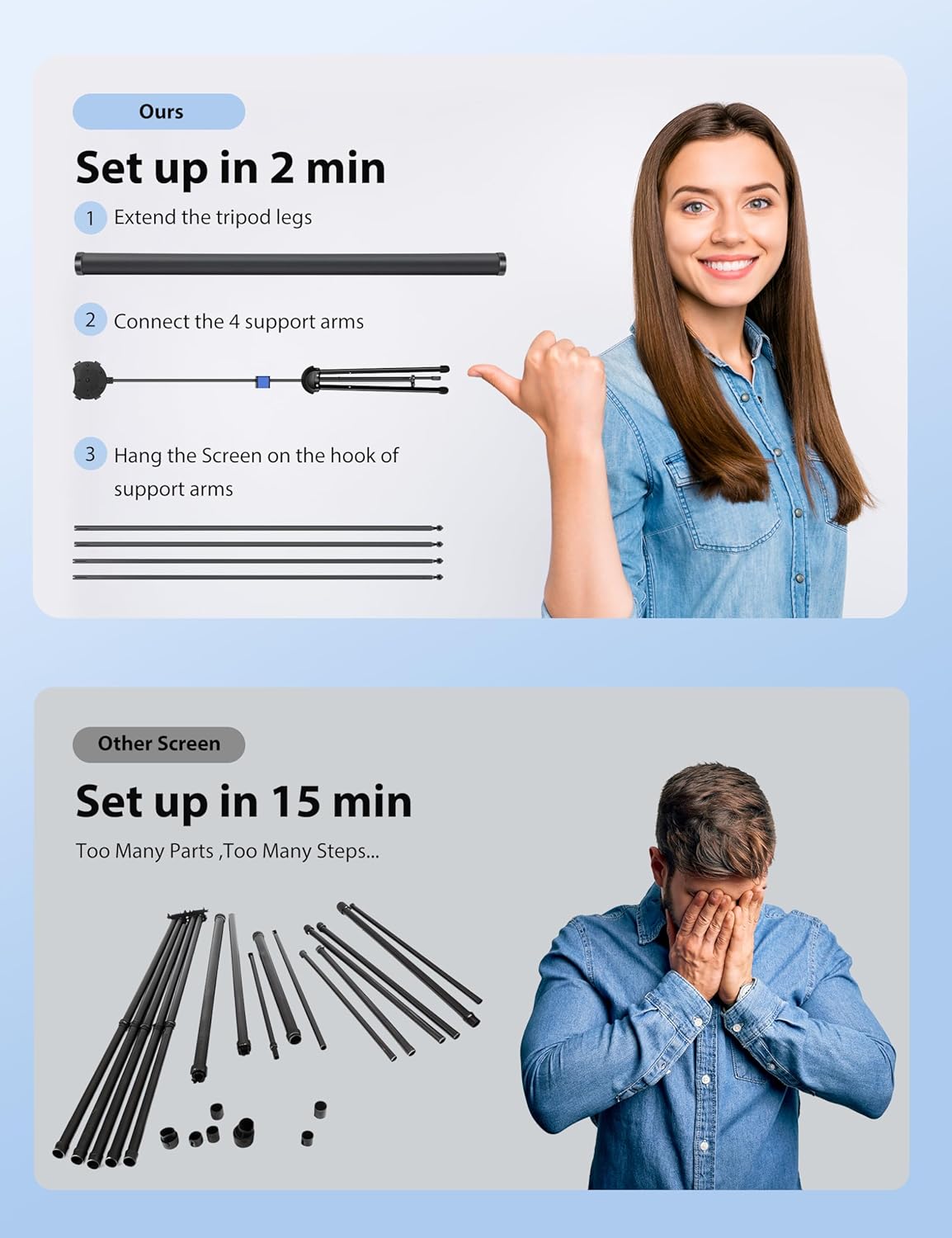 - 🥰Portable + Easy to Store: PVC material is generally used for professional-grade screens which are thick and unfoldable, so difficult to carry. Our screens take advantage of the detachability and foldability of the tripod and combine it with travel needs, retaining professional-grade screens while achieving portability.Only 3 steps, one person can install it in 2 minutes. Also, it can be easily disassembled and takes up only a small storage space. Comes with a bag for carrying out.
