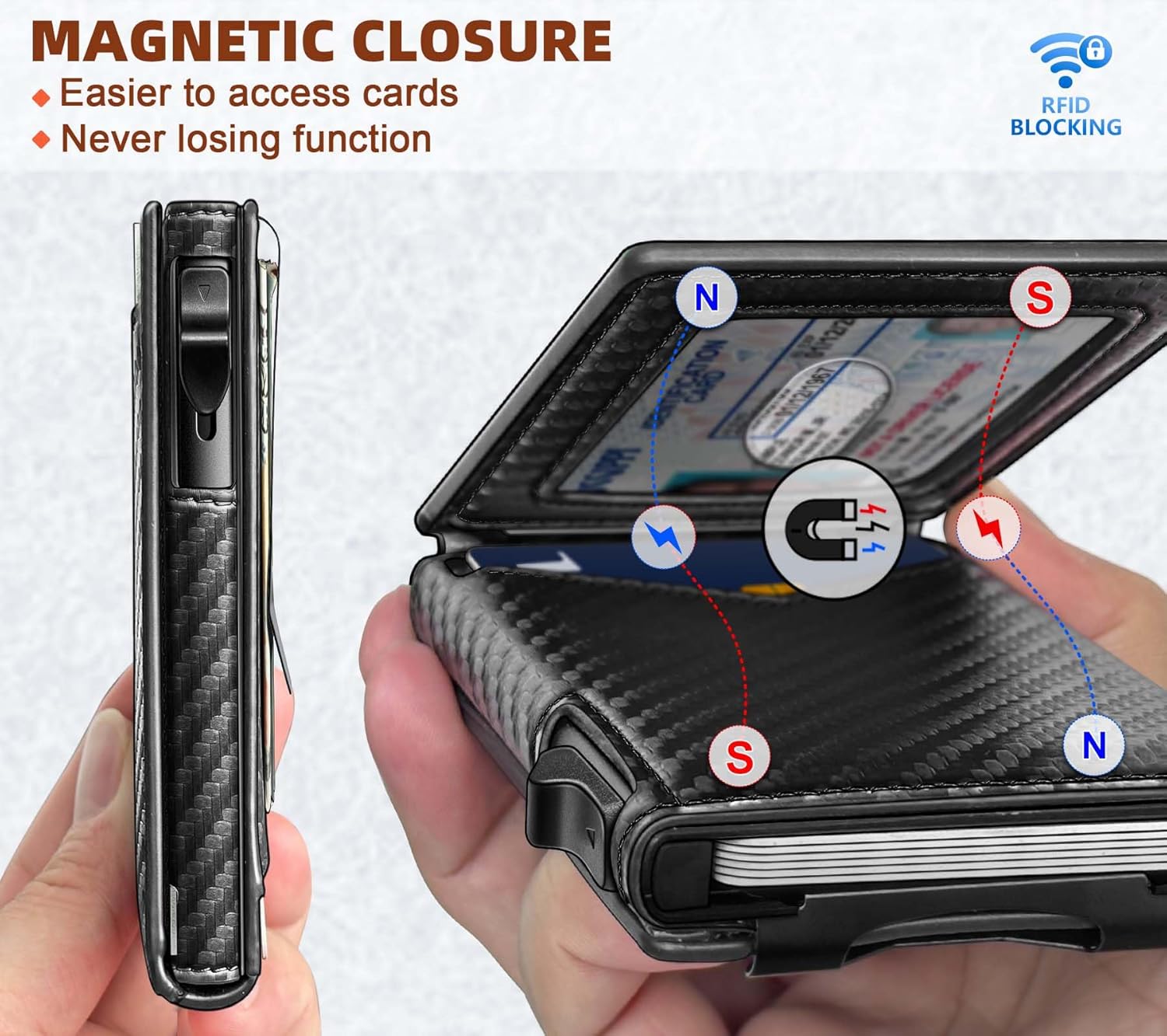 - CAPACITY-Pop-up metal Case in flipping leather shell,9 card slots (including 1 ID window) and metal money clip for couple of bills;
