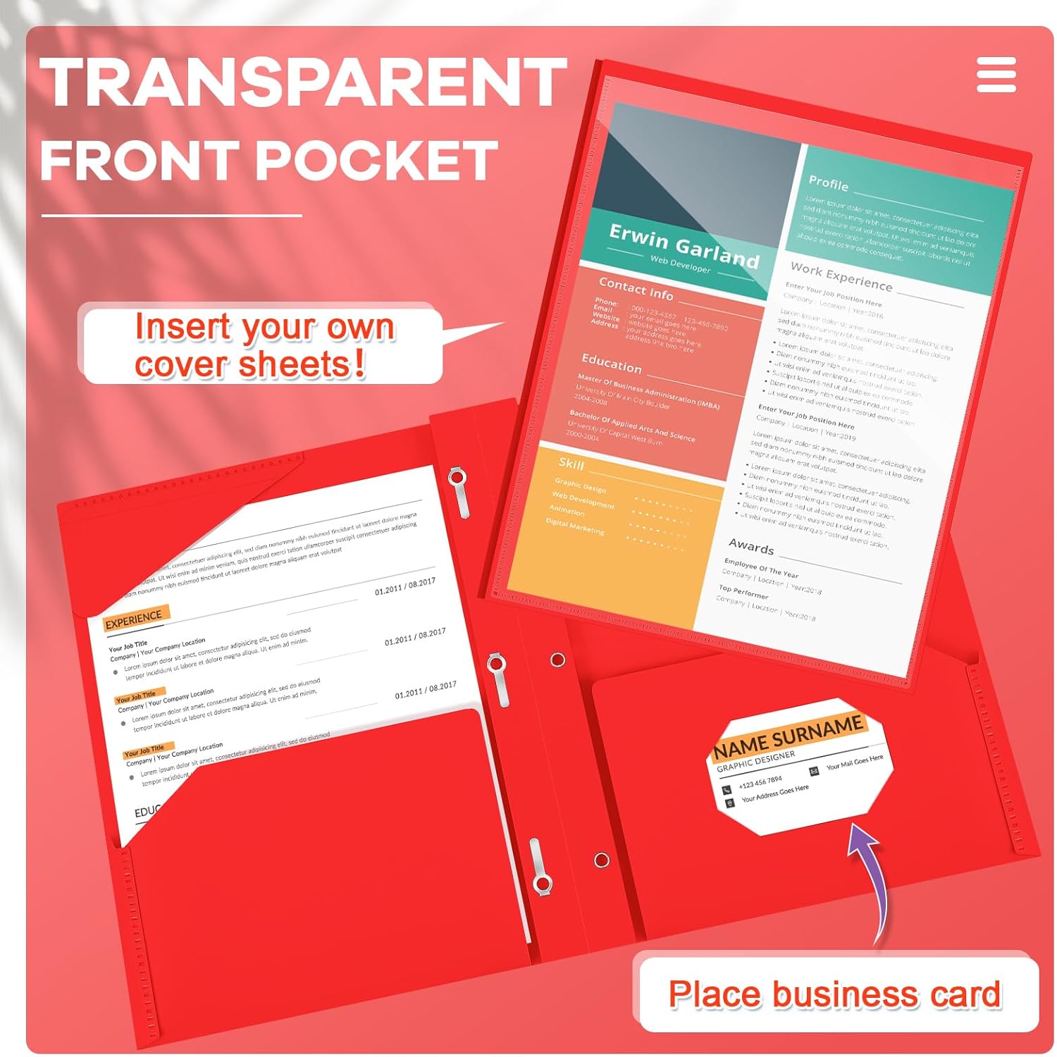 - Practical for You: with a clear front pocket, you can put your catalog, tables, favorite reports, presentations and more for clear display; Each plastic folder has 2 internal pockets to help organize and store your letter sized paper and documents; There are also 3 prongs to secure your 3 hole loose leaf paper in case it falls, and the card slot can hold your ID card or business card, practical for your daily work
