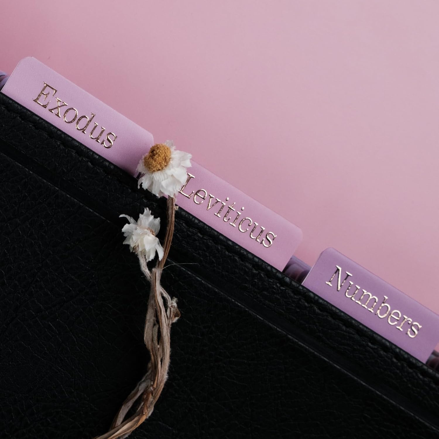 - Large Print, Easy to Read & Easy to Install: Silky velvet touch laminate,carefully designed pretty Bible accessories . The peel-and-stick Bible index tabs are self adhesive, simply align them with the provided guide or place them creatively.
